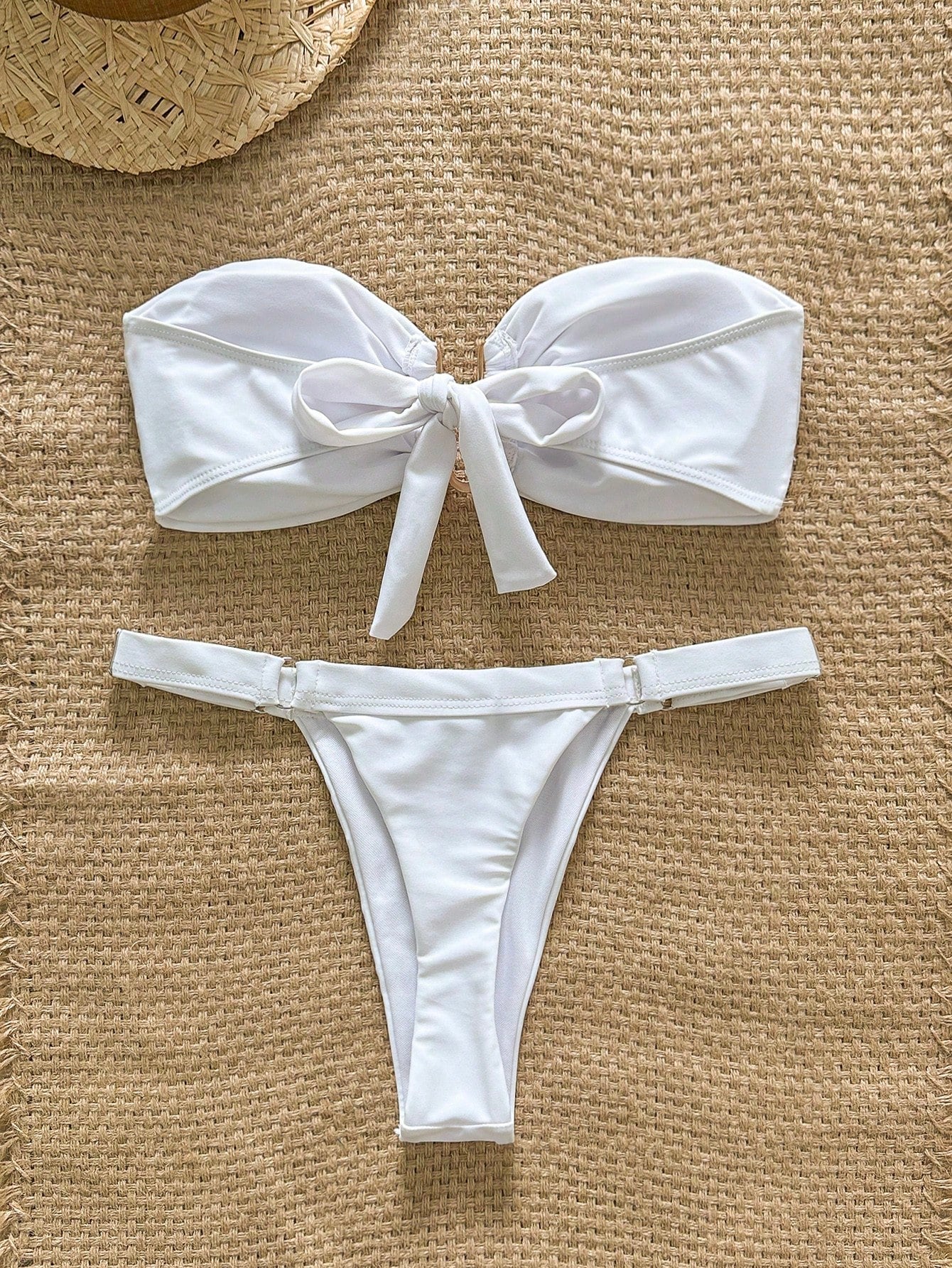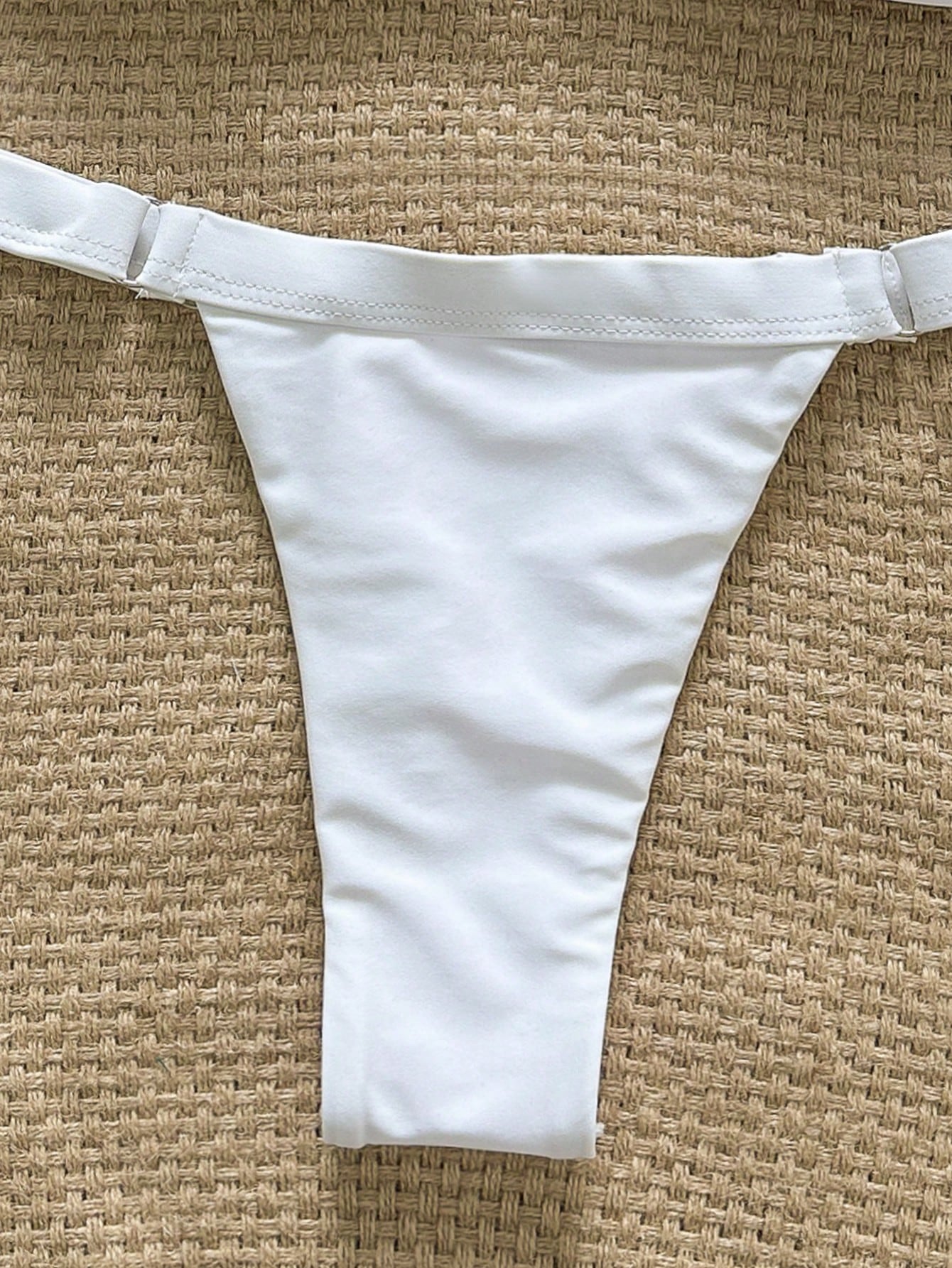 El bikini blanco bandeau que presentamos es una combinación impecable entre diseño moderno y minimalismo elegante. Su top tipo bandeau sin aros proporciona soporte cómodo gracias a sus almohadillas extraíbles y un ajuste firme gracias al cierre posterior con lazo. El punto focal de esta pieza es el delicado aplique metálico dorado al centro del busto, que crea un efecto visual sofisticado y sutilmente atrevido.