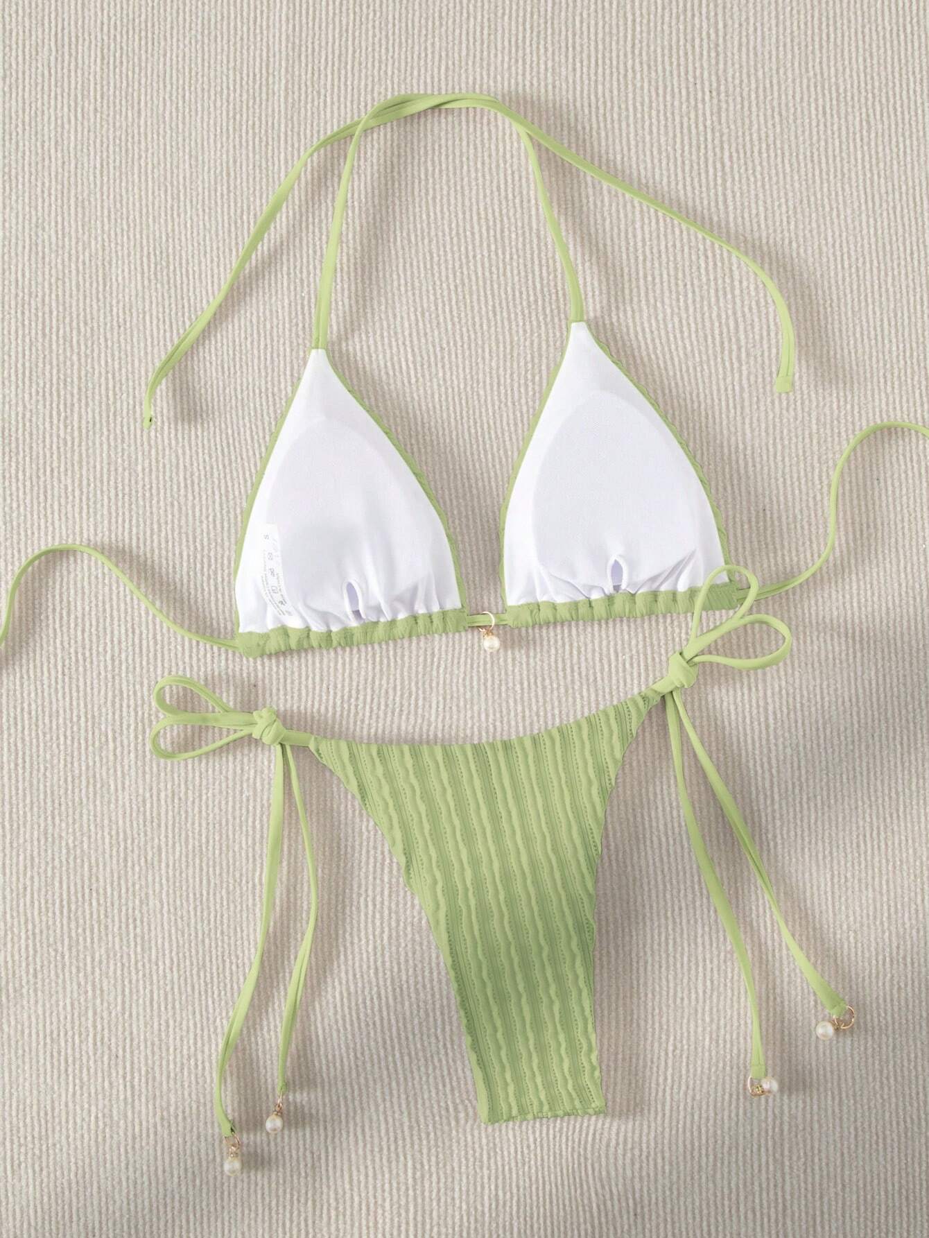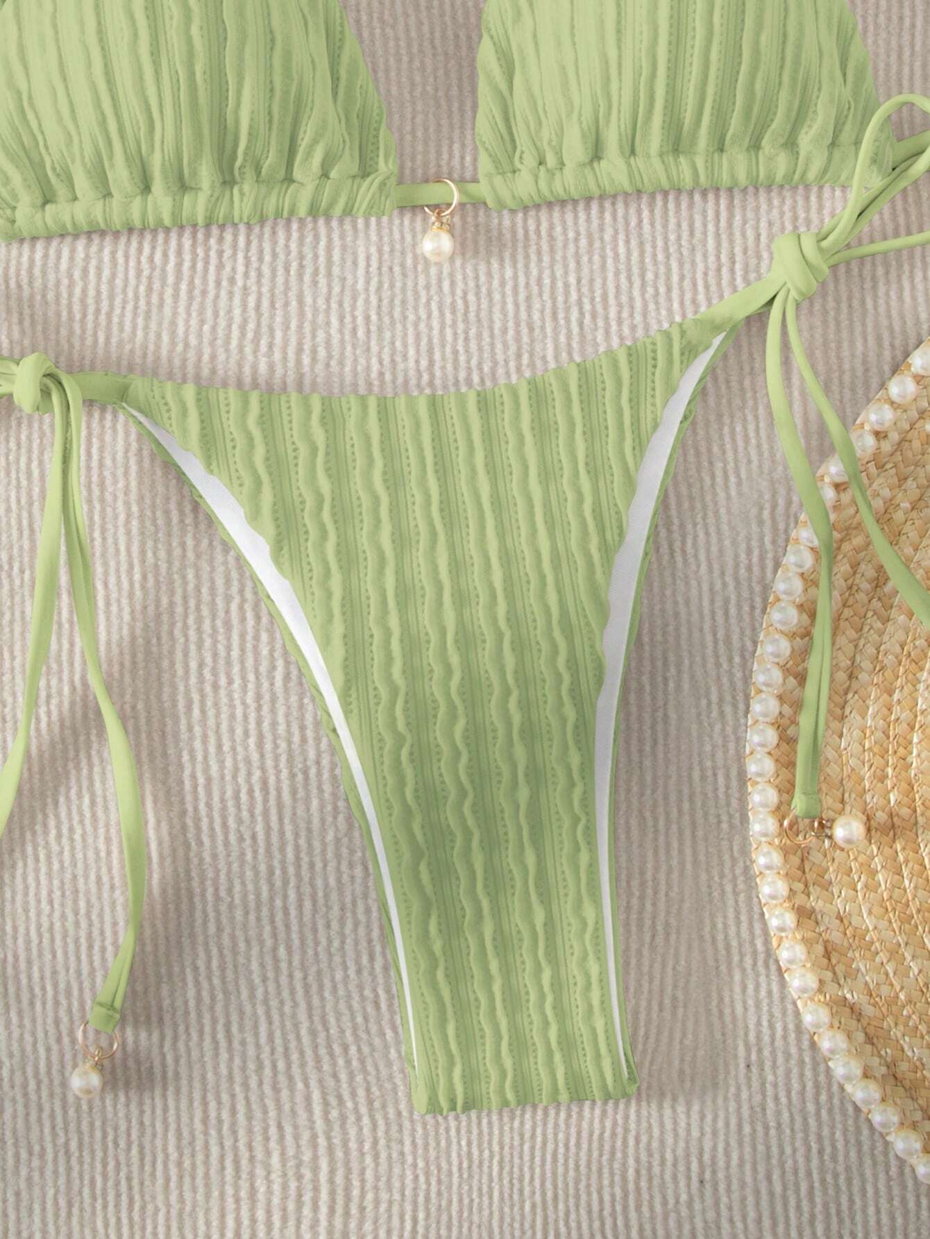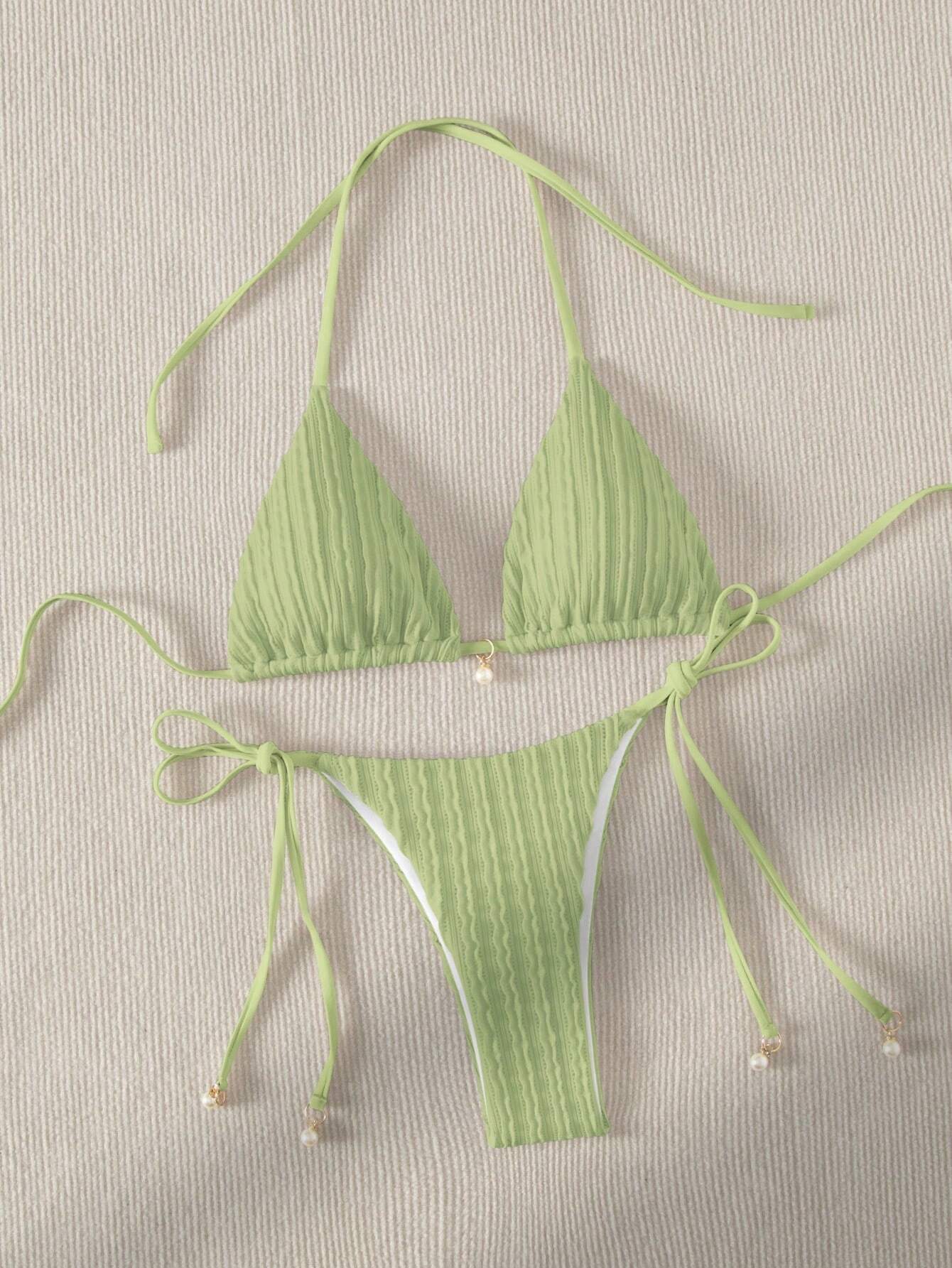 Este bikini verde con ajuste perfecto ha sido diseñado para brindarte seguridad y estilo. Su top de escote halter con detalles de perlas añade un toque de sofisticación, mientras que el bottom de lazo permite ajustarlo según tu preferencia, proporcionando un ajuste cómodo y favorecedor.