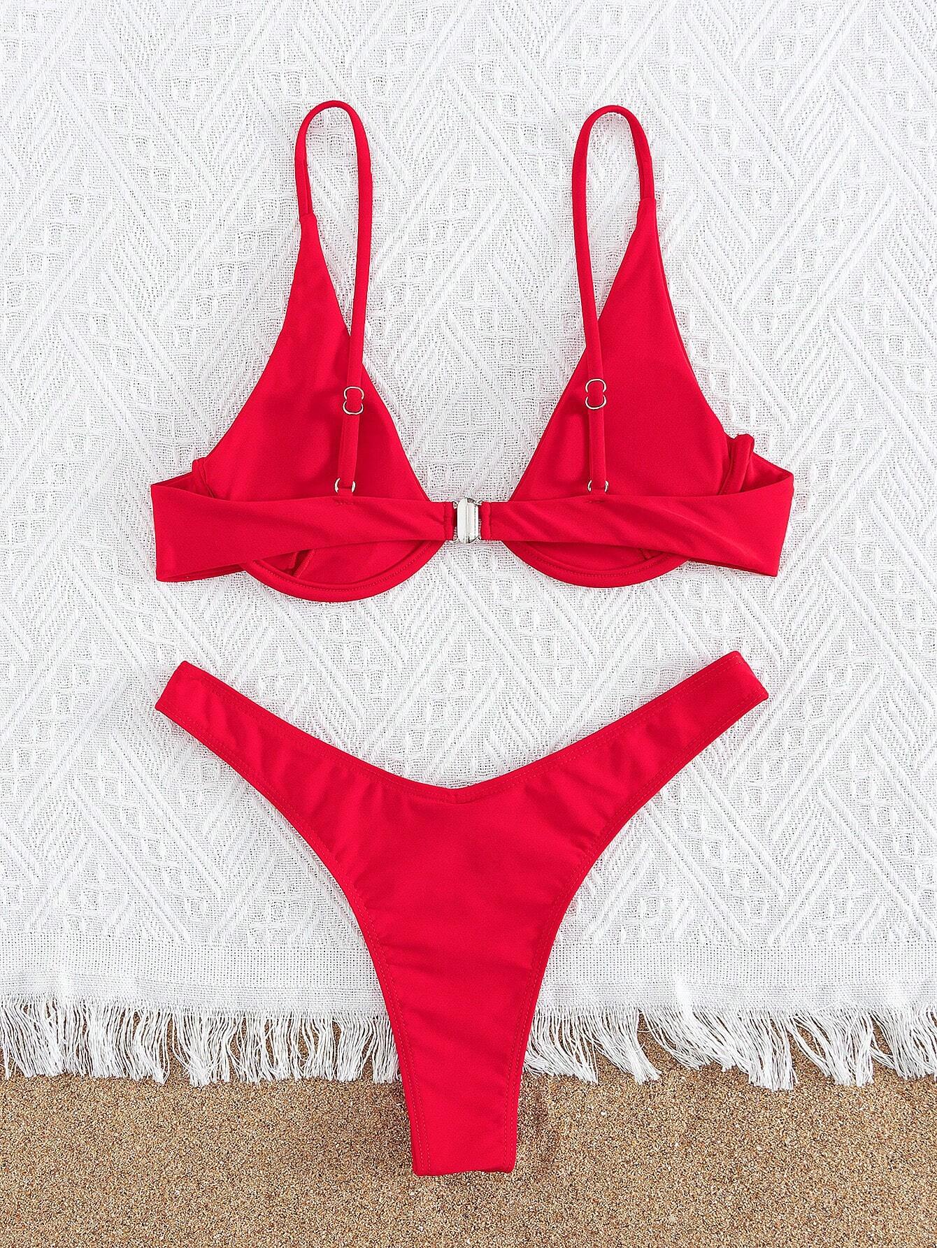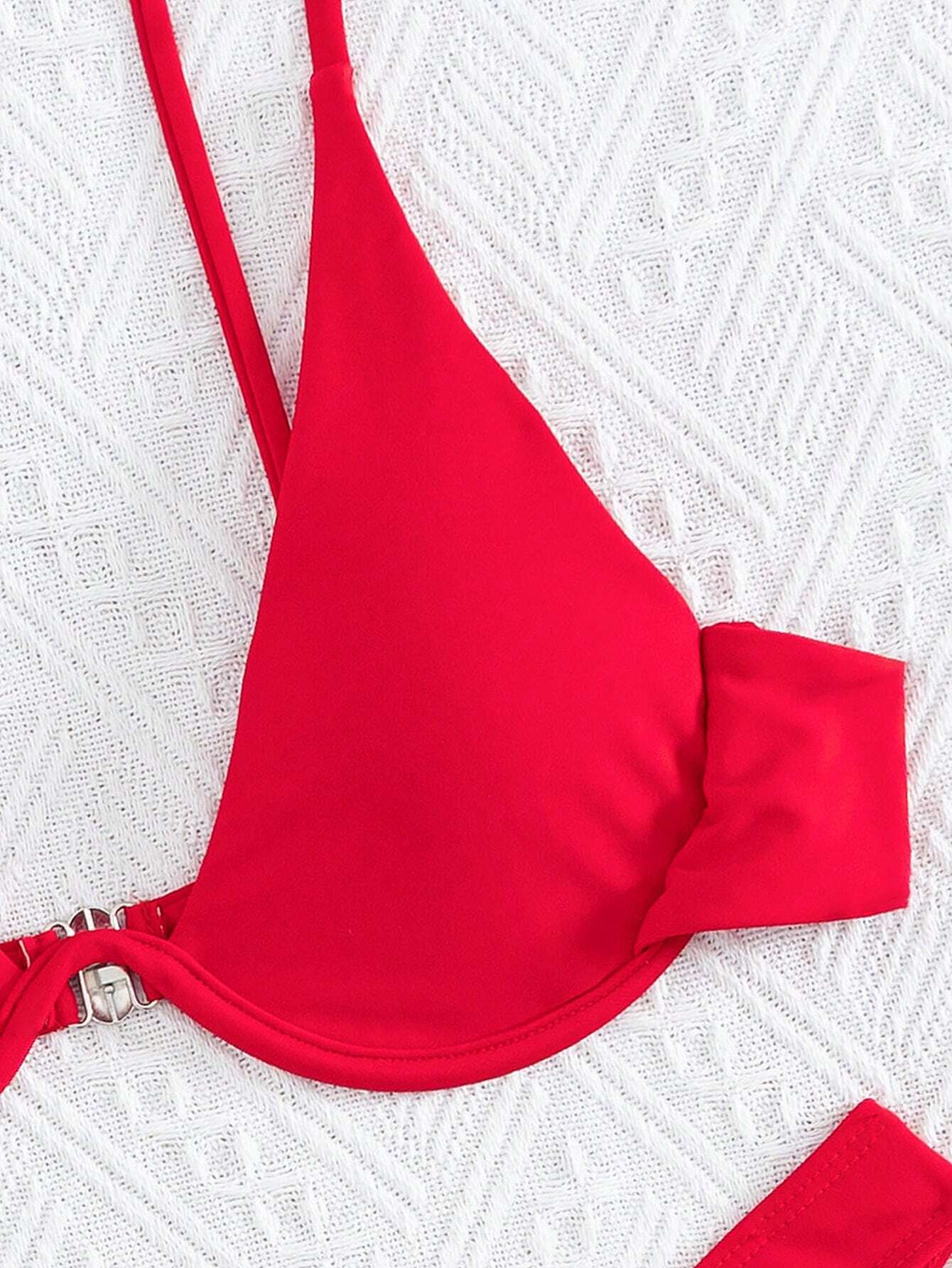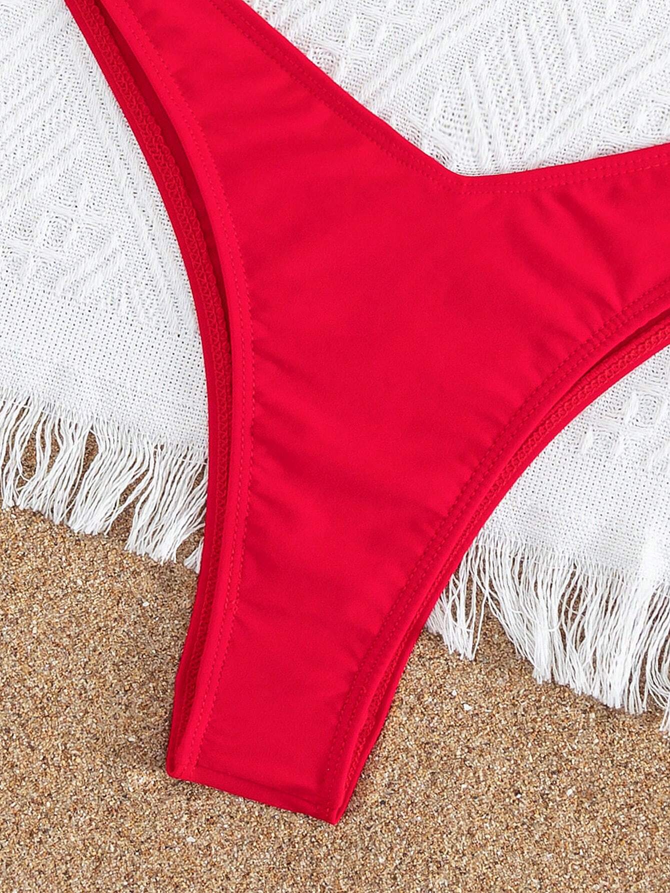 Este bikini push up rojo ha sido diseñado para brindarte soporte y realce sin sacrificar la comodidad. Gracias a su tejido de elástico alto, este set de dos piezas se ajusta a tu figura sin perder su forma. El bottom de corte alto y talle alto estiliza la cintura y alarga visualmente las piernas, ideal para quienes buscan un look sofisticado en la playa o la piscina.