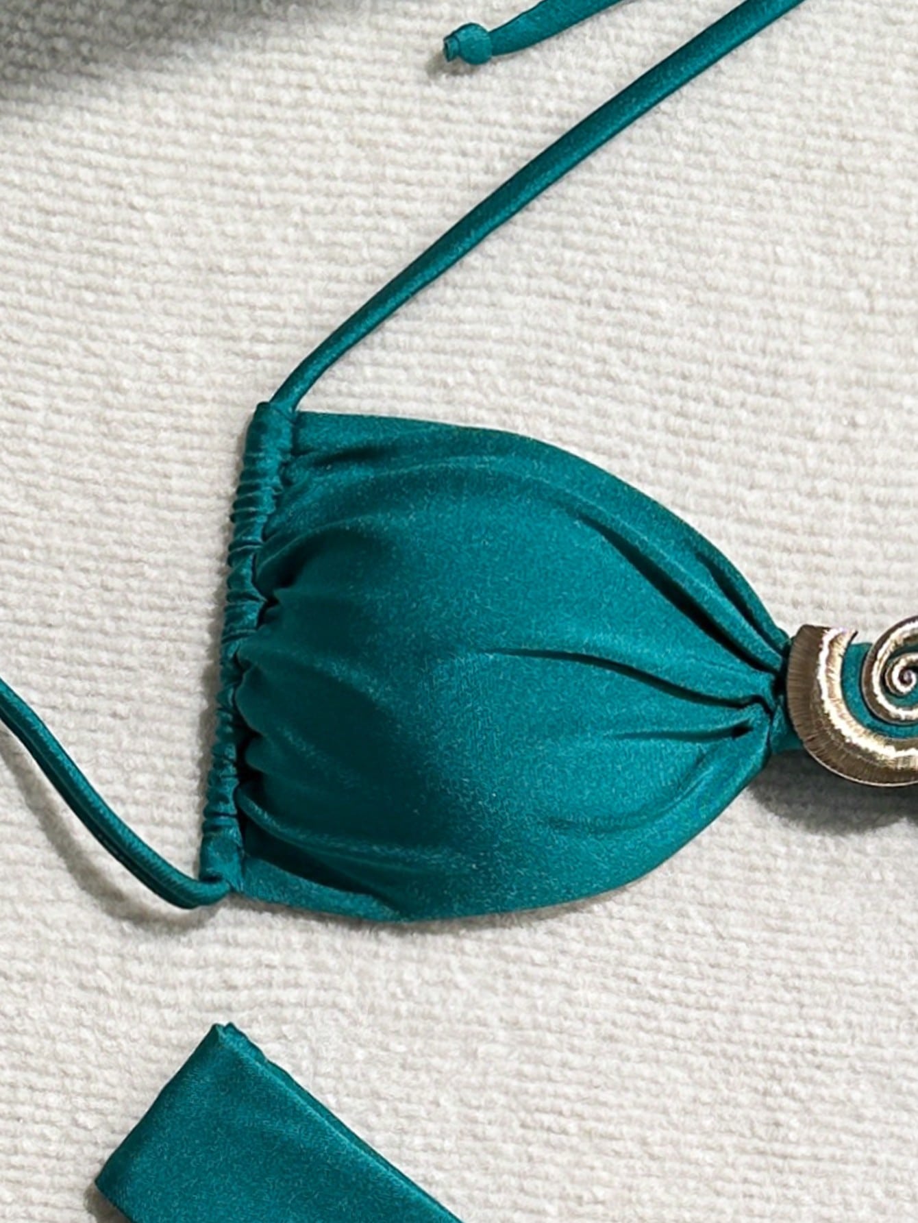 El bikini sexy verde destaca por su estructura minimalista con detalles de alto impacto. Su top tipo bandeau con escote de tirantes finos y copas 3/4 ofrece un soporte cómodo, mientras que el centro del busto cuenta con una anilla decorativa en espiral que agrega un toque moderno y glamuroso. La braguita de talle bajo y corte alto estiliza la figura, alargando visualmente las piernas y resaltando las curvas. La tela, una mezcla de poliamida y elastano, proporciona un ajuste perfecto y alta elasticidad, adaptándose suavemente al cuerpo sin marcar.