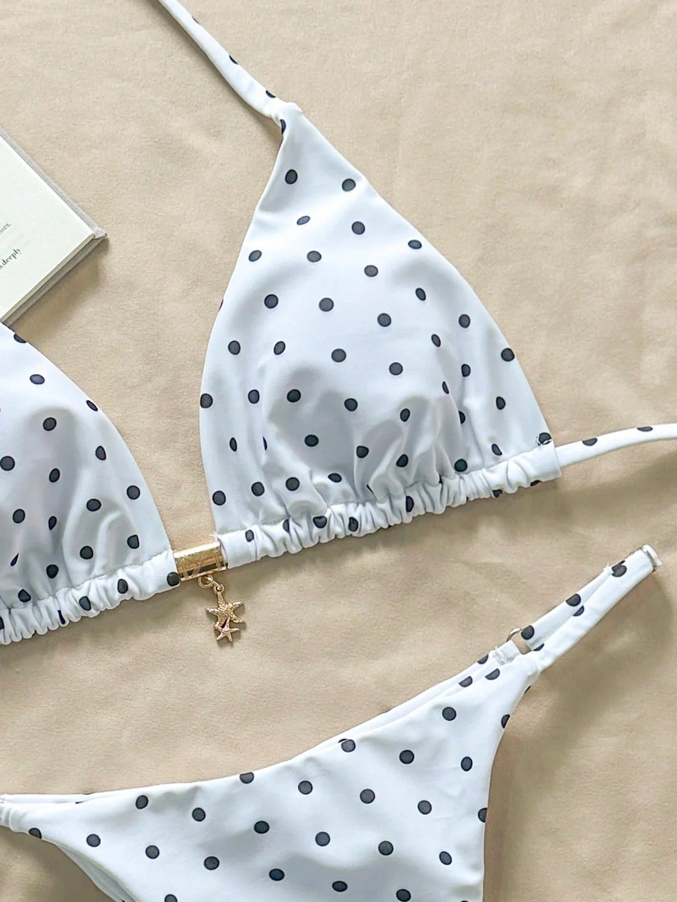 Este bikini de lunares combina la coquetería de un estampado clásico con un diseño moderno y sensual. La parte superior de copa triangular presenta un corte halter con tiras ajustables que se anudan al cuello y espalda, permitiendo un ajuste personalizado que se adapta a todo tipo de cuerpo. La pieza central metálica con colgante en forma de estrella de mar agrega un toque dorado encantador que eleva el diseño y lo hace ideal para destacar bajo el sol.