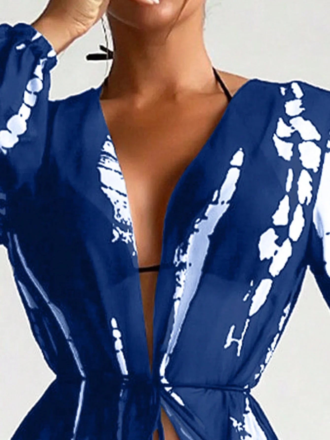 El kimono largo tie-dye azul es la definición de estilo sofisticado para tus looks veraniegos. Su tejido ligero y fluido está compuesto por 95% poliéster y 5% elastano, lo que lo hace suave, cómodo y con una elasticidad sutil que permite una caída elegante sobre la silueta. Su diseño semitransparente resalta la feminidad y lo convierte en una prenda ideal para superponer sobre bikinis o enterizos. Incluye un cinturón que se ajusta a la cintura, generando un efecto favorecedor, mientras que el lazo frontal agrega un toque de delicadeza y personalidad.