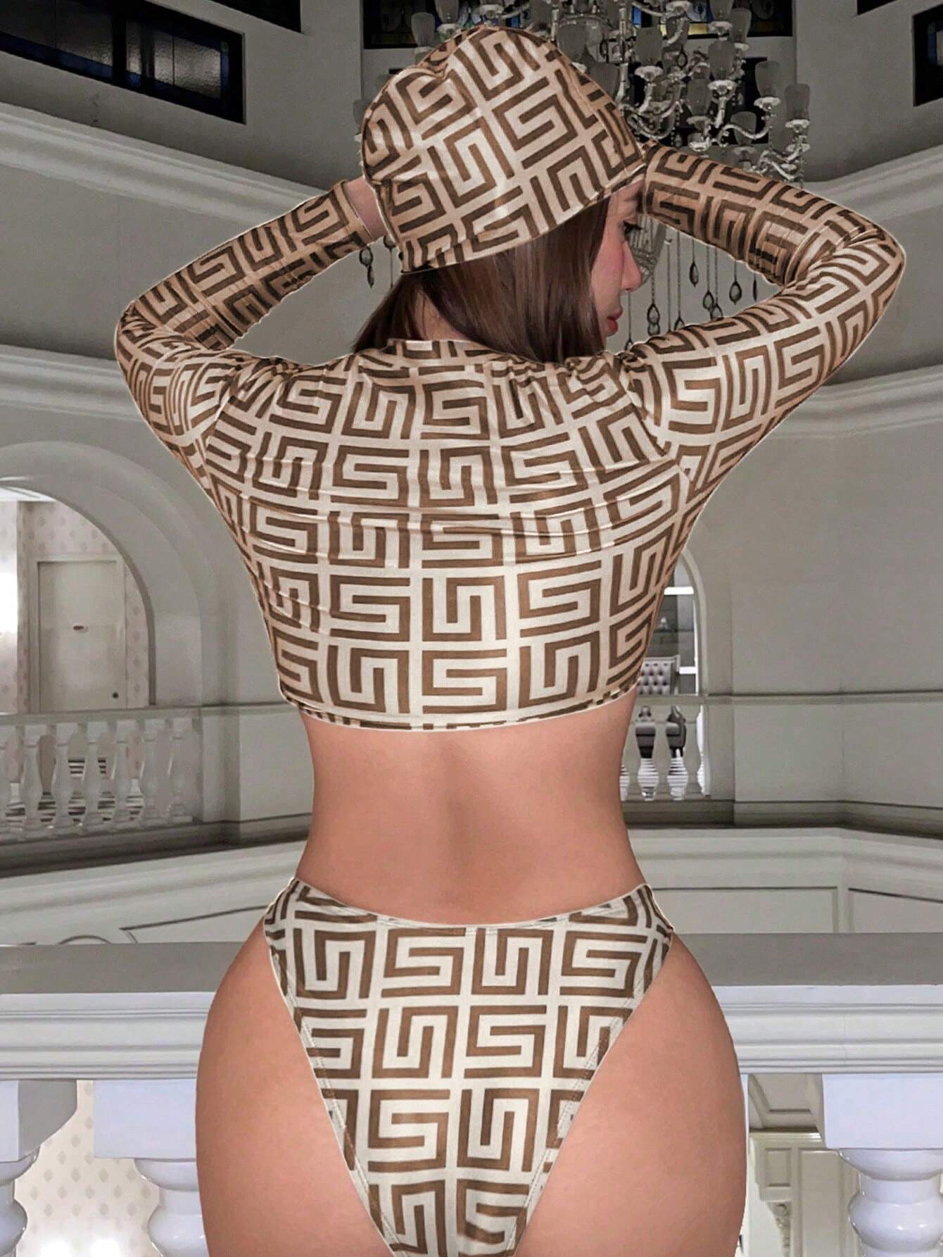 Este bikini café integral no solo es perfecto para la playa o la piscina, sino también para escenarios de moda más atrevidos como conciertos, noches de fiesta o sesiones de fotos con impacto. El patrón geométrico integral en tono café sobre fondo claro aporta dinamismo visual, mientras que el diseño de manga larga añade un toque vanguardista que se adapta tanto a climas templados como a looks nocturnos. Su versatilidad lo hace un infaltable en tu colección si buscas trajes de baño que también funcionen como prendas de moda urbana. Este bikini café integral incluye un gorro a juego que complementa el look, añadiendo un toque urbano que realza aún más su estilo único.