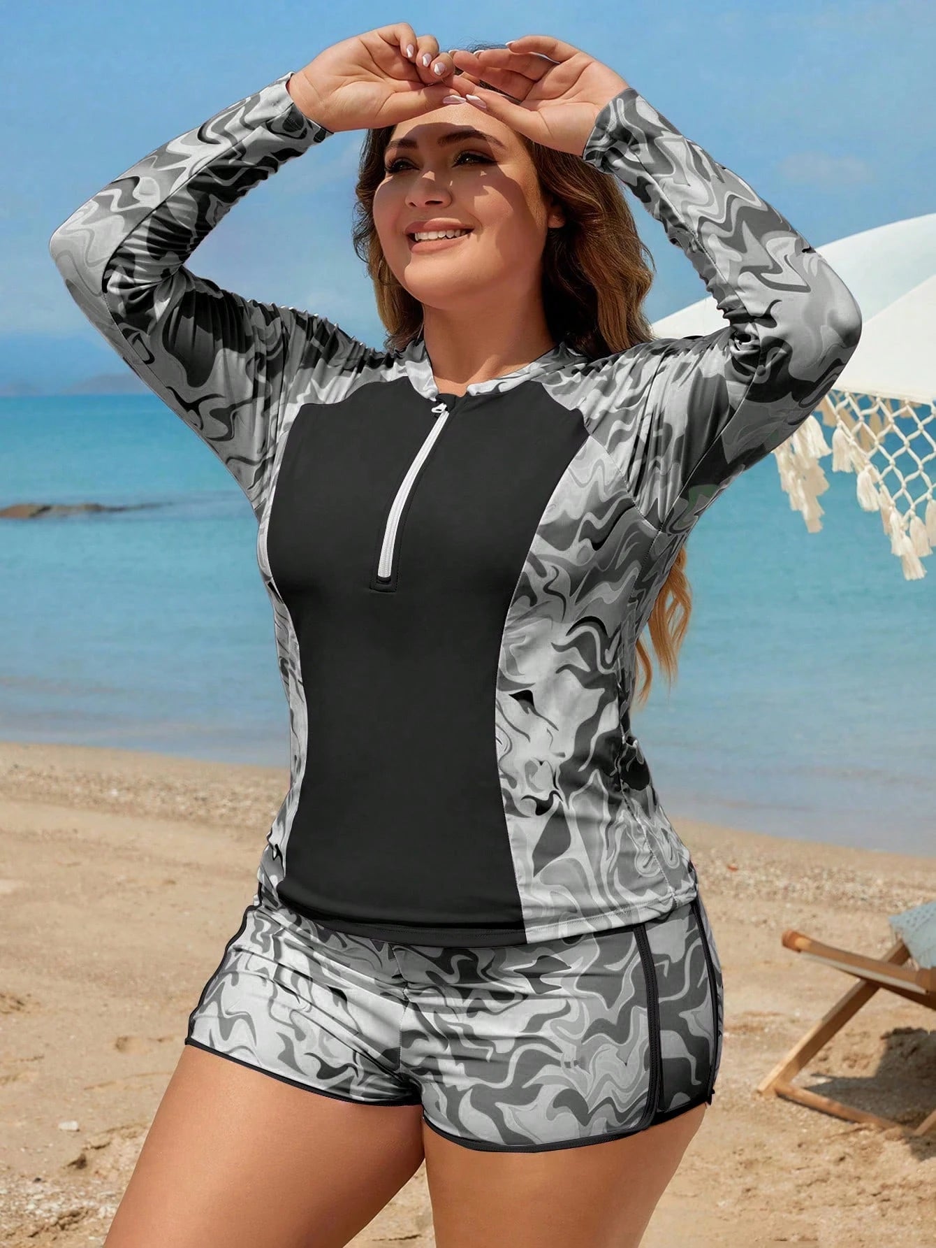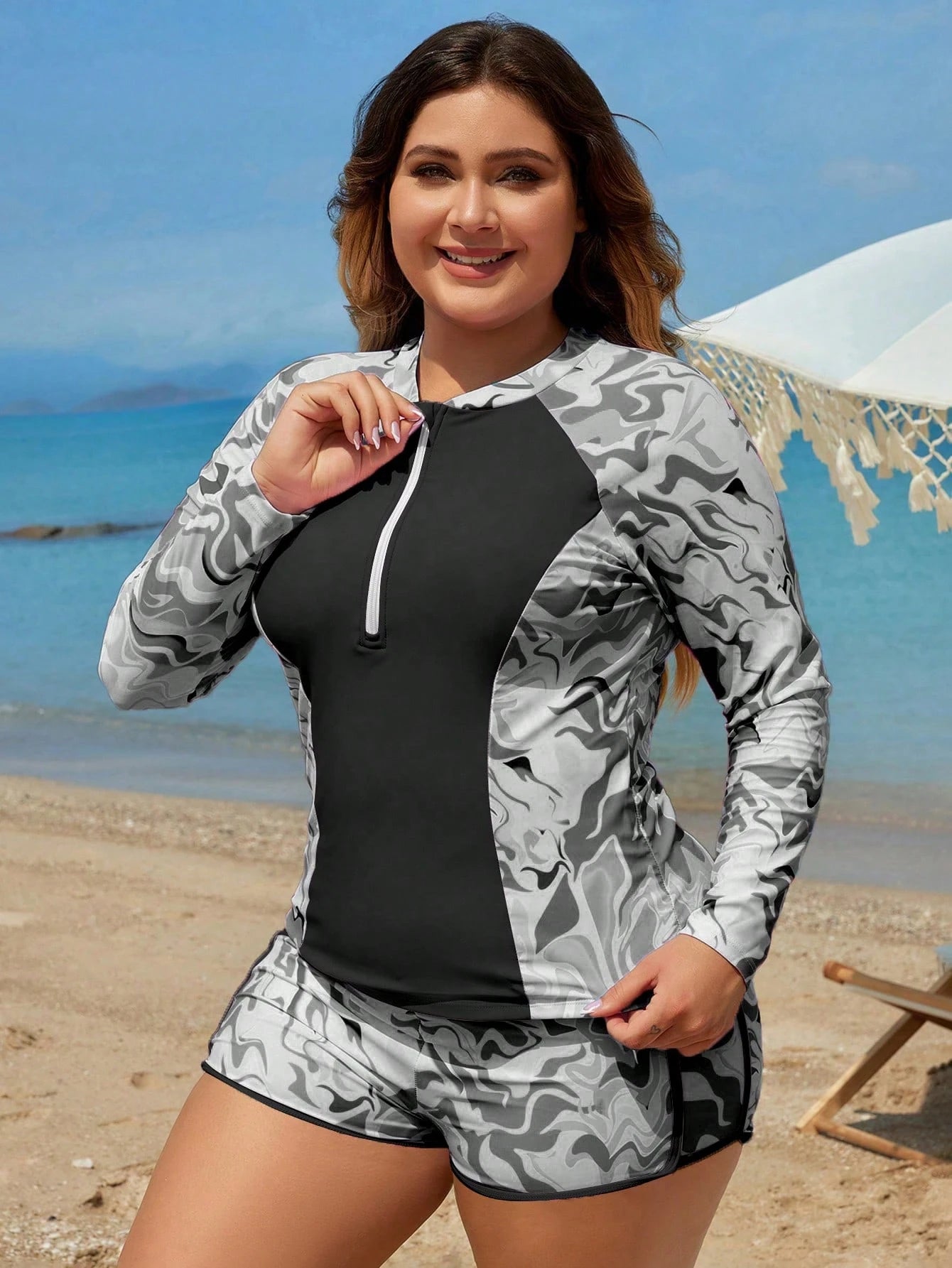 Diseñado para mujeres activas que buscan estilo, comodidad y funcionalidad, el set de bikini deportivo blanco y negro con cremallera y estampado integral es una prenda de alto rendimiento sin sacrificar el diseño. El top de manga larga cuenta con cuello cisne y cierre frontal que permite ajustar la abertura según tu comodidad. La combinación de negro sólido con detalles en blanco y un estampado integral tipo mármol crea un contraste visual moderno y elegante. Está confeccionado con tela de alta elasticidad y durabilidad que se adapta al cuerpo con suavidad y libertad. Además, incluye almohadillas extraíbles para mayor soporte.