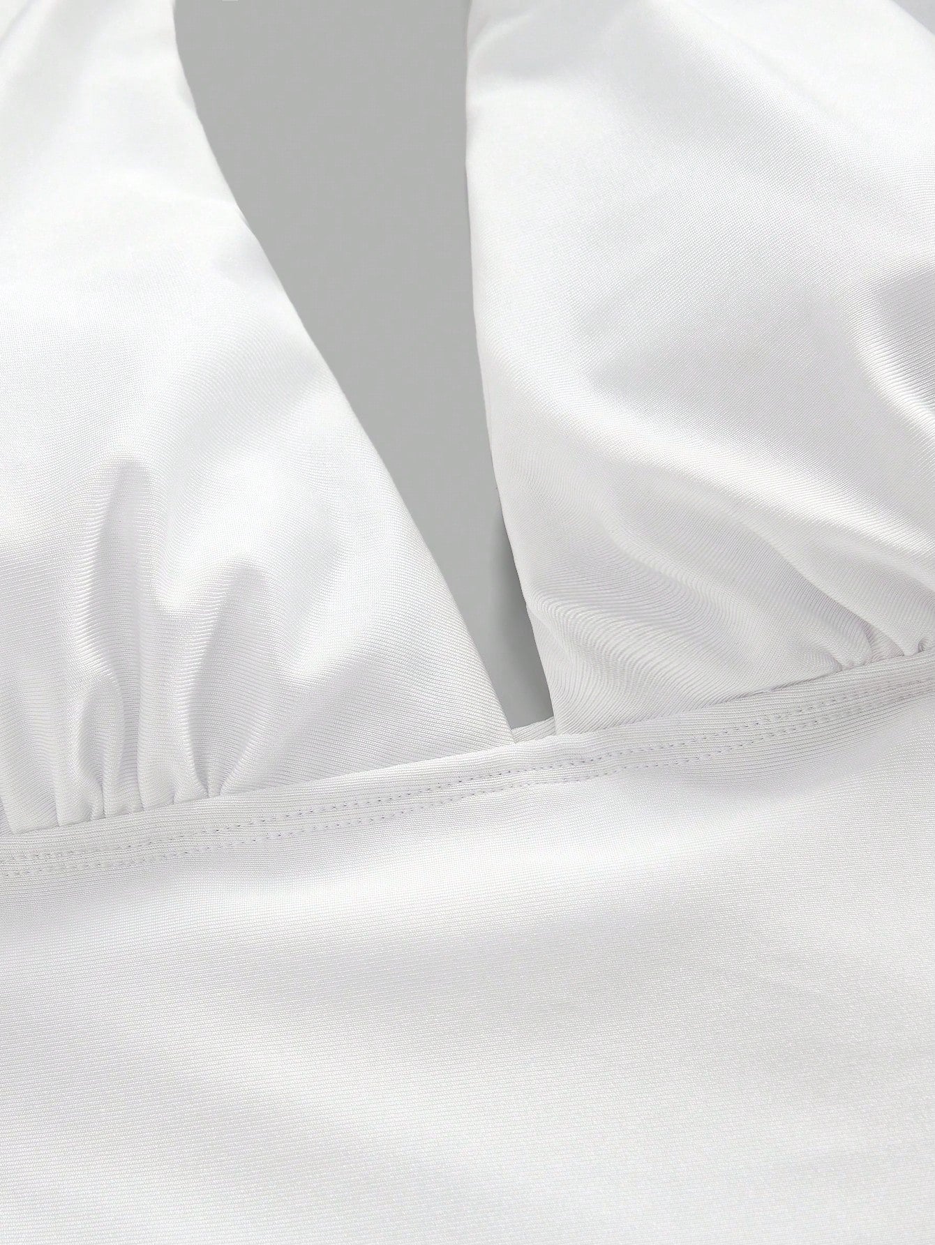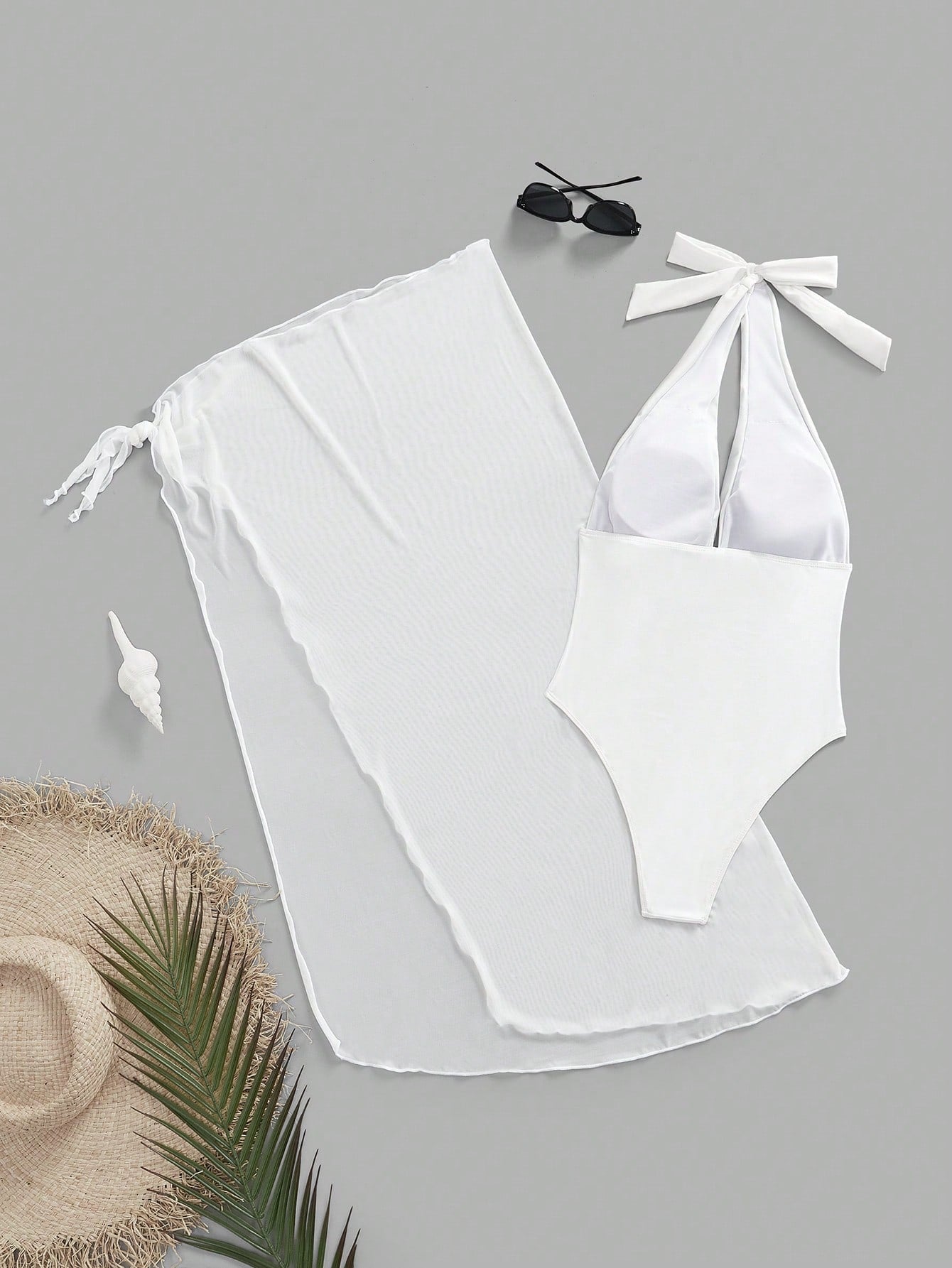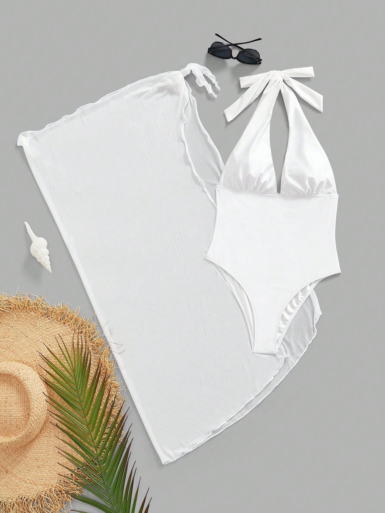 El traje de baño blanco está confeccionado con materiales de alta calidad que combinan poliamida y elastano para ofrecer una textura suave, ligera y elástica. Su diseño de escote halter con nudo posterior realza la figura y aporta un toque sofisticado, mientras que la espalda al aire asegura frescura y comodidad en climas cálidos. La prenda cuenta con forro interior y almohadillas extraíbles que brindan soporte sin sacrificar la naturalidad. Además, incluye una salida de playa semitransparente a juego, pensada para complementar el look y hacer que luzcas impecable tanto dentro como fuera del agua.