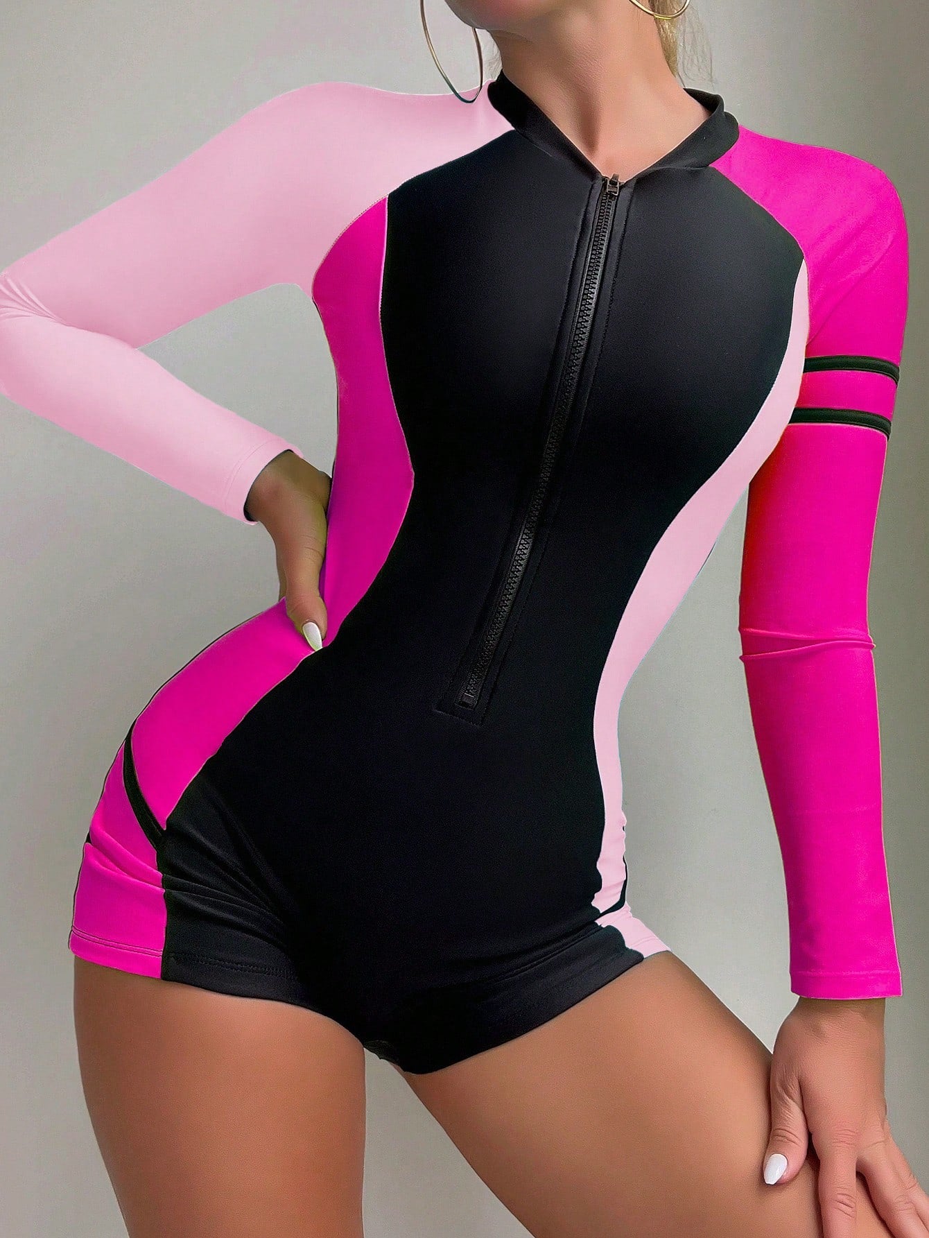 El traje de baño deportivo multicolor combina modernidad, confort y practicidad en una sola prenda. Confeccionado en tela elástica de alta resistencia, su diseño con cremallera frontal asegura un ajuste firme y personalizado, ideal para deportes acuáticos como natación, surf o actividades en la playa. Su estilo de manga larga y cuello tipo cisne no solo brinda un look innovador, sino que también protege la piel de la exposición al sol.