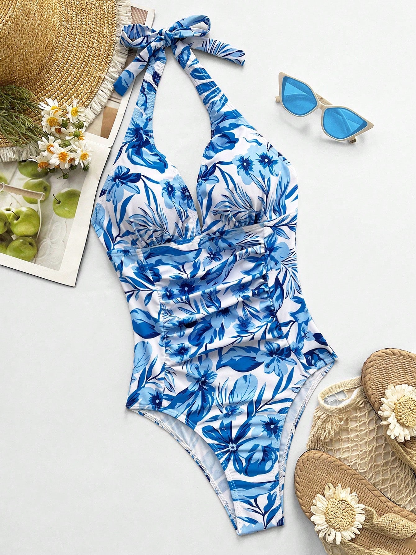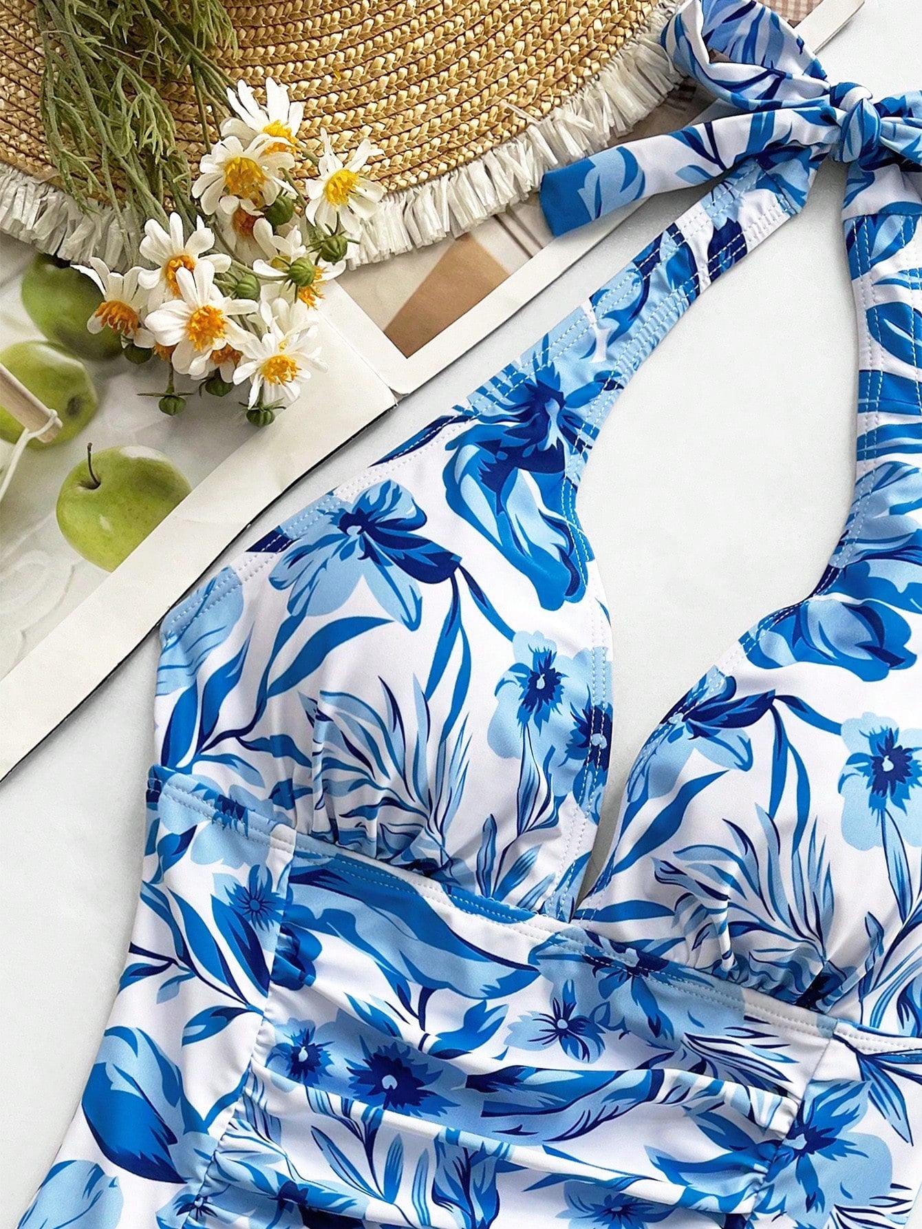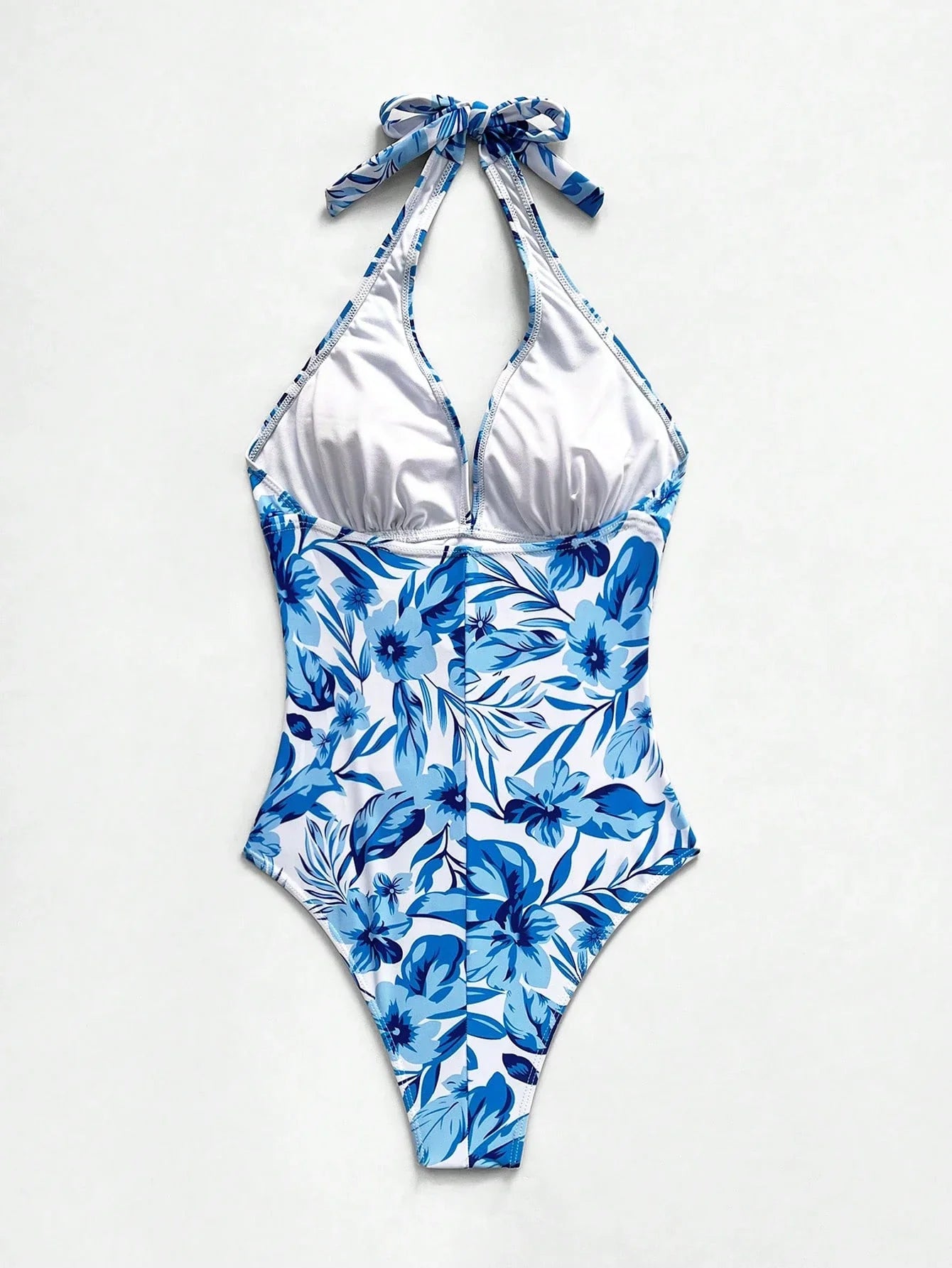 Descubre la mezcla perfecta entre elegancia tropical y soporte con este traje de baño entero tropical azul y blanco. Su estampado integral de hojas y flores en tonos vibrantes de azul sobre fondo blanco le da un aire fresco y veraniego, ideal para tus días bajo el sol. El escote halter con copas push up realza el busto de forma natural, mientras que el corte completo ofrece una silueta estilizada.