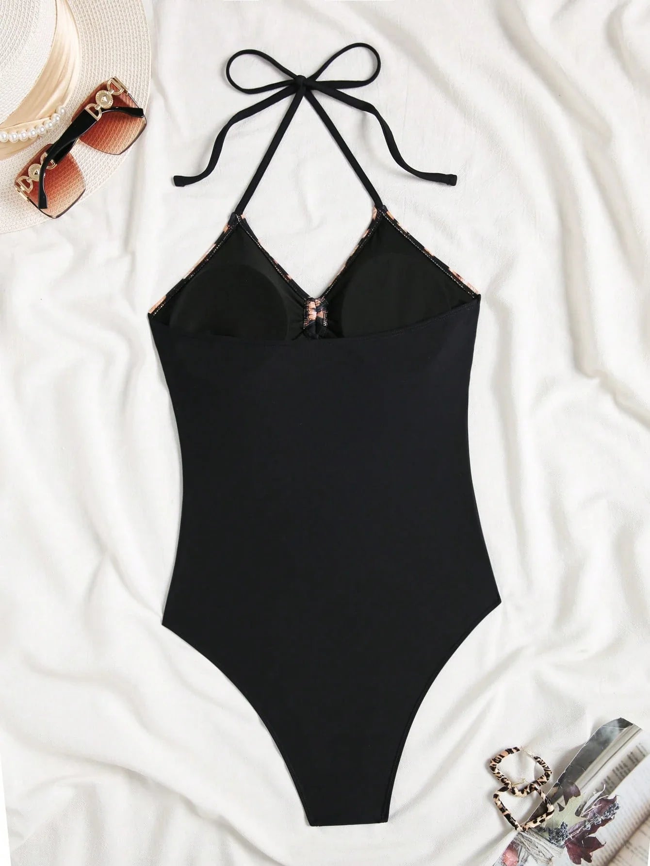 Detalles: Escote halter con cordón, espalda al aire, ribete animal print