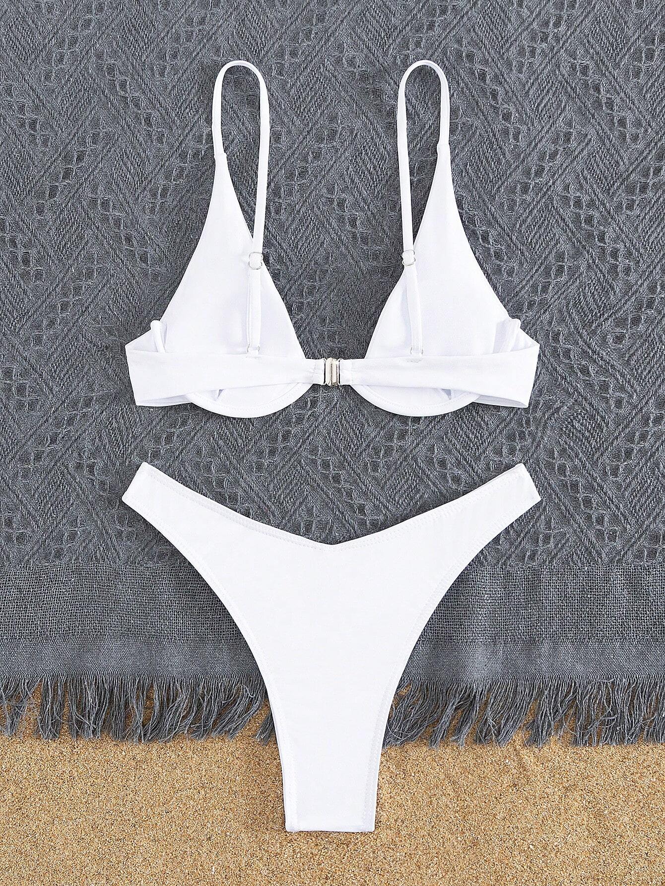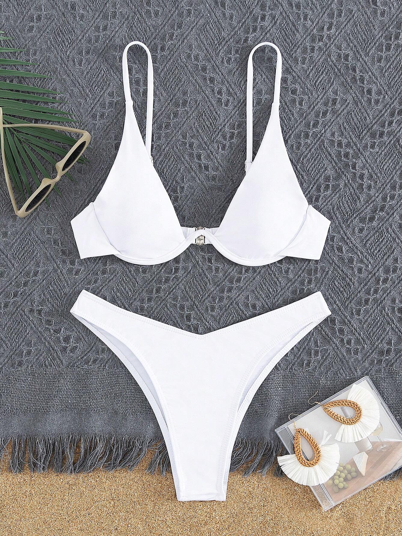 Este bikini push up blanco ha sido diseñado para brindarte soporte y realce sin sacrificar la comodidad. Gracias a su tejido de elástico alto, este set de dos piezas se ajusta a tu figura sin perder su forma. El bottom de corte alto y talle alto estiliza la cintura y alarga visualmente las piernas, ideal para quienes buscan un look sofisticado en la playa o la piscina.