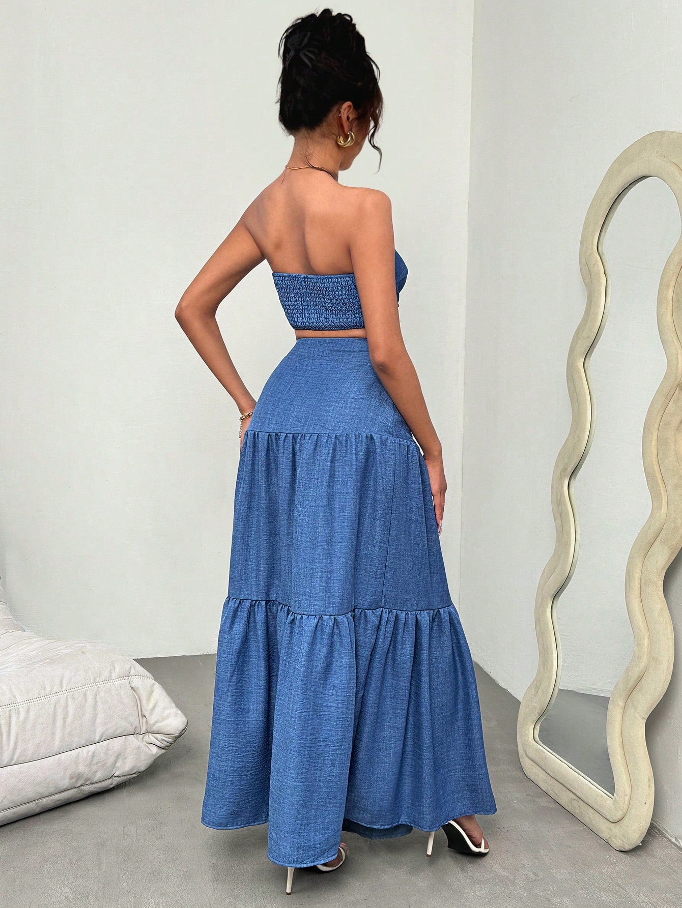Este conjunto azul de top bandeau y falda maxi es la definición perfecta de feminidad moderna y comodidad sofisticada. Diseñado para realzar la silueta, el top bandeau tipo crop presenta un delicado fruncido frontal que aporta un toque sensual y favorecedor, mientras su ajuste ceñido brinda seguridad y soporte sin necesidad de tirantes.