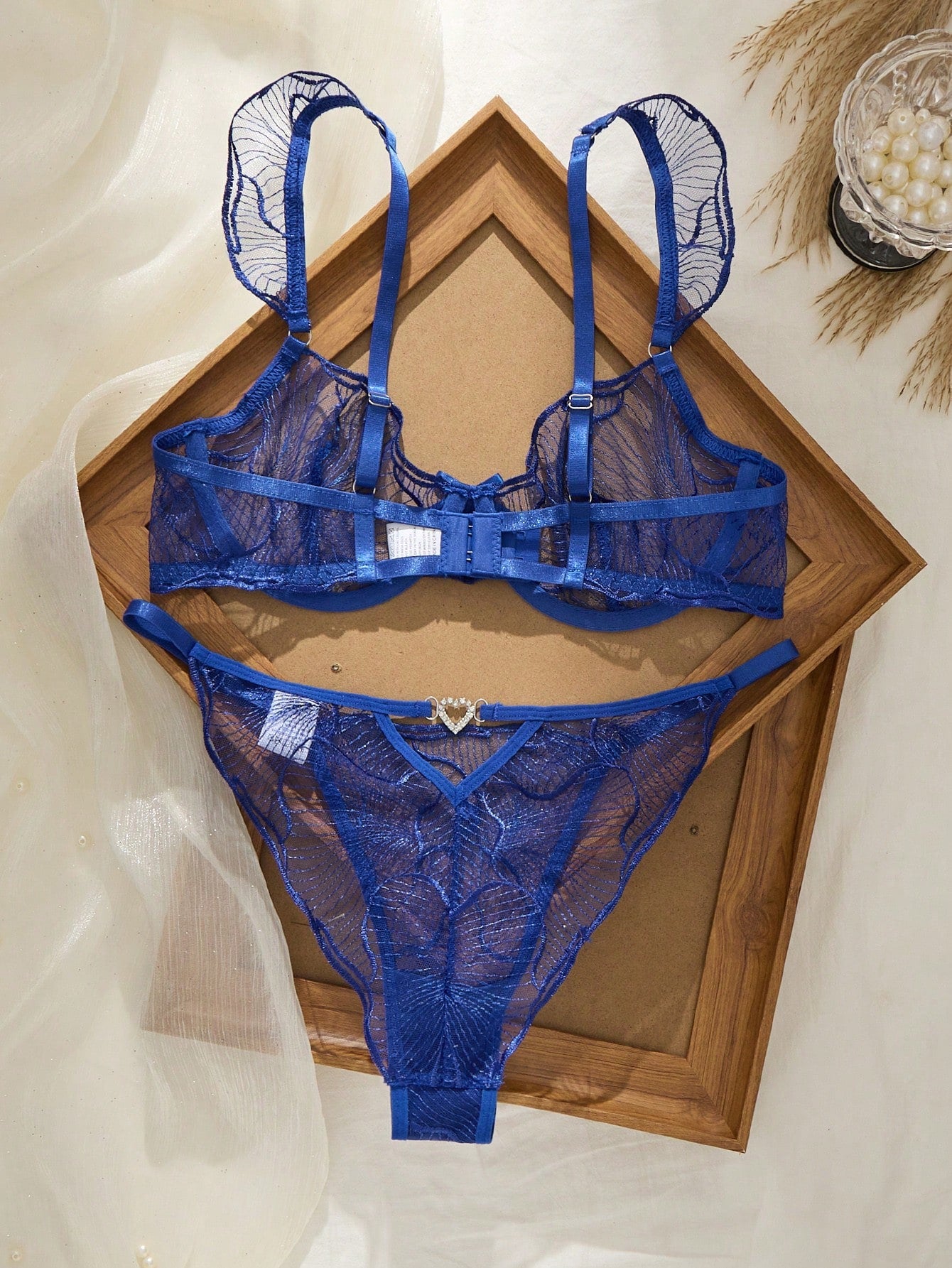 Este conjunto de lencería azul real transparente con aro tipo balconette destaca por su bordado fino y su estructura cuidada. Debido a su diseño semitransparente, la prenda crea un juego visual atractivo sin perder delicadeza. Además, el aro incorporado proporciona una sujeción equilibrada, lo que mejora el ajuste general.