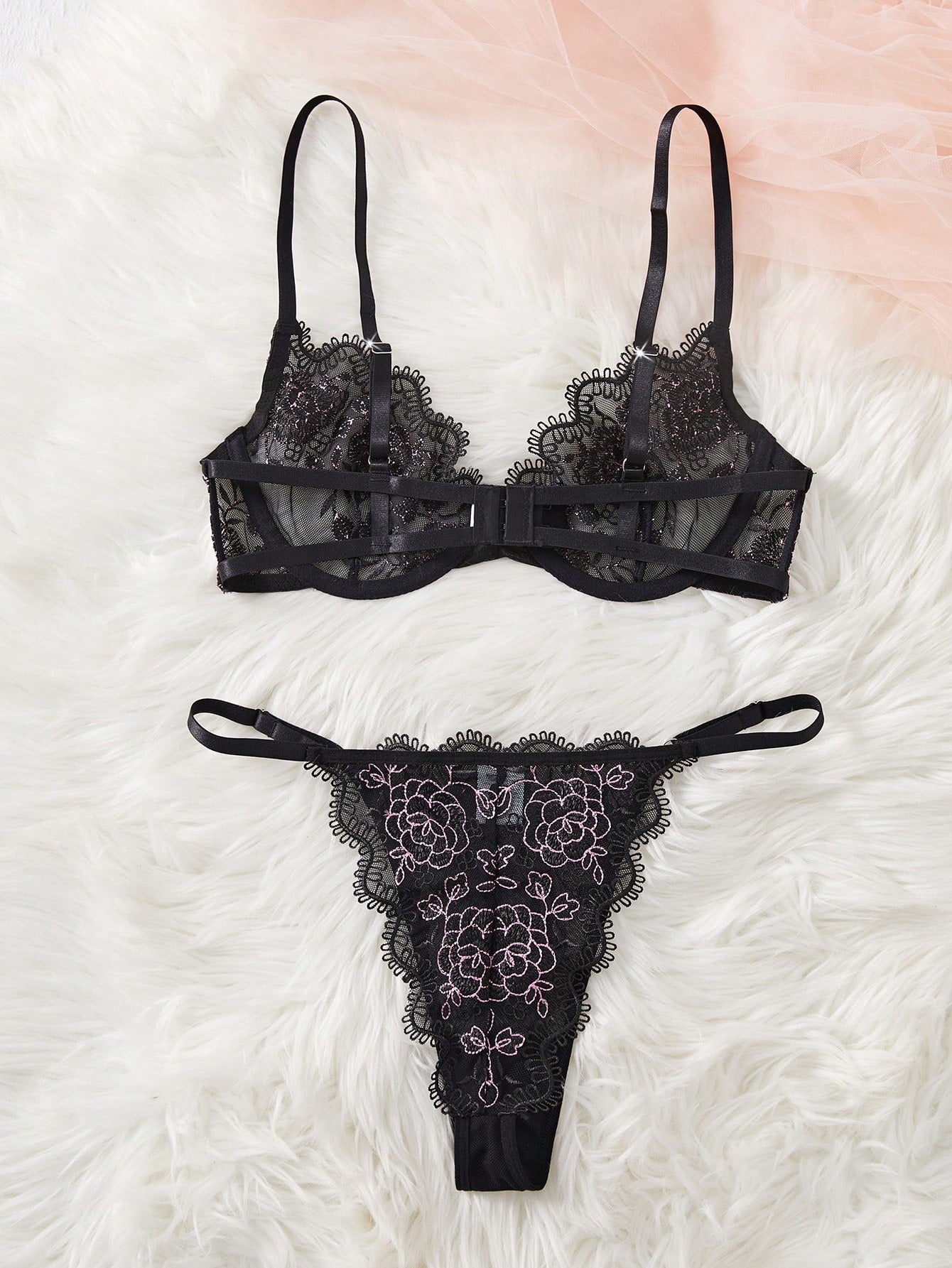 El Conjunto De Lencería Negra Bordada Con Tanga está diseñado para mujeres que desean expresar sofisticación, sensualidad y seguridad en cada detalle. Desde el primer vistazo, este set destaca por su delicado bordado floral en contraste, el cual aporta un aire romántico y elegante sin perder ese toque de fantasía irresistible. Además, el color negro clásico lo convierte en una pieza atemporal, perfecta para momentos especiales.
