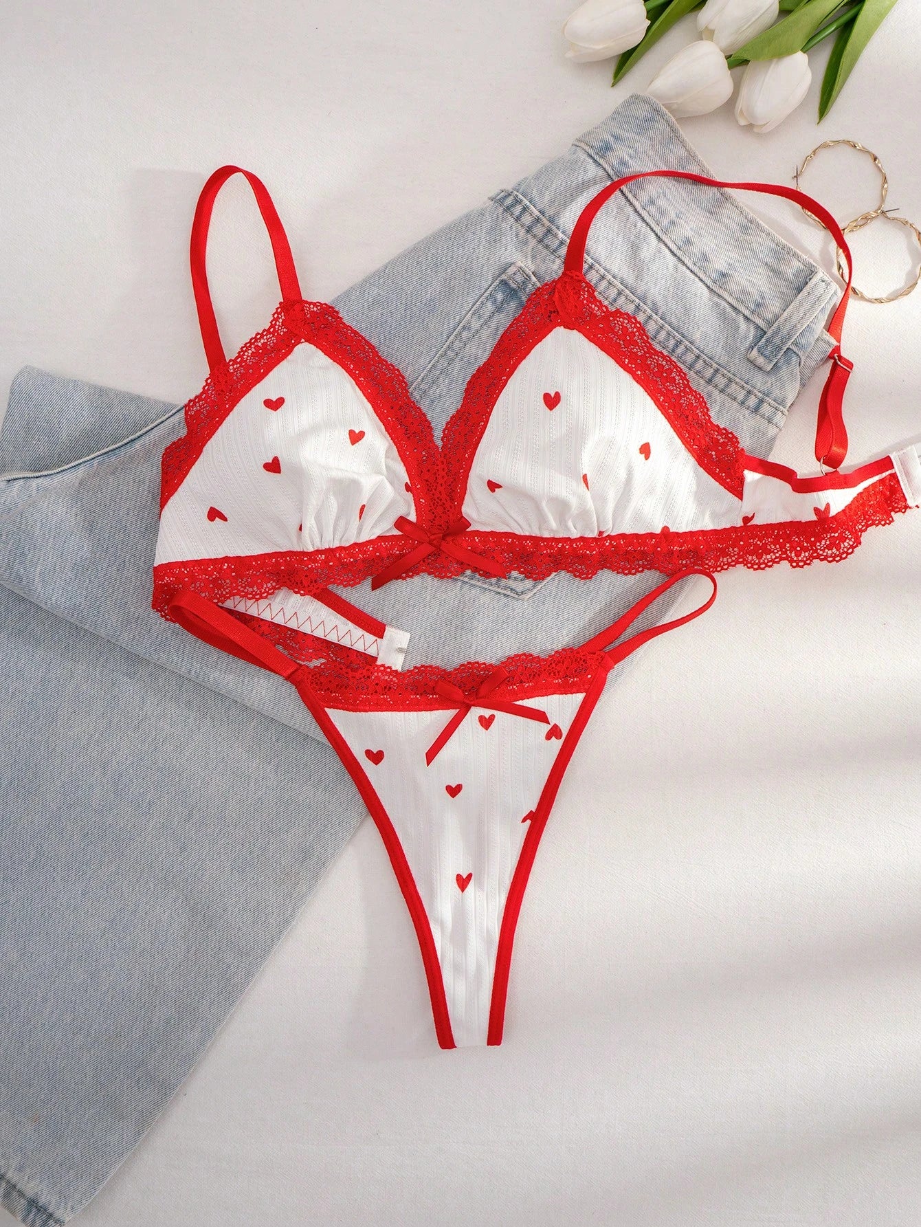 Este conjunto destaca por su combinación de colores rojo y blanco, una mezcla clásica asociada al amor y la pasión. El encaje en contraste no solo embellece el diseño, sino que también aporta un acabado delicado que eleva la prenda. Además, el estampado de pequeños corazones distribuidos sobre la tela crea un efecto visual atractivo y juvenil.
