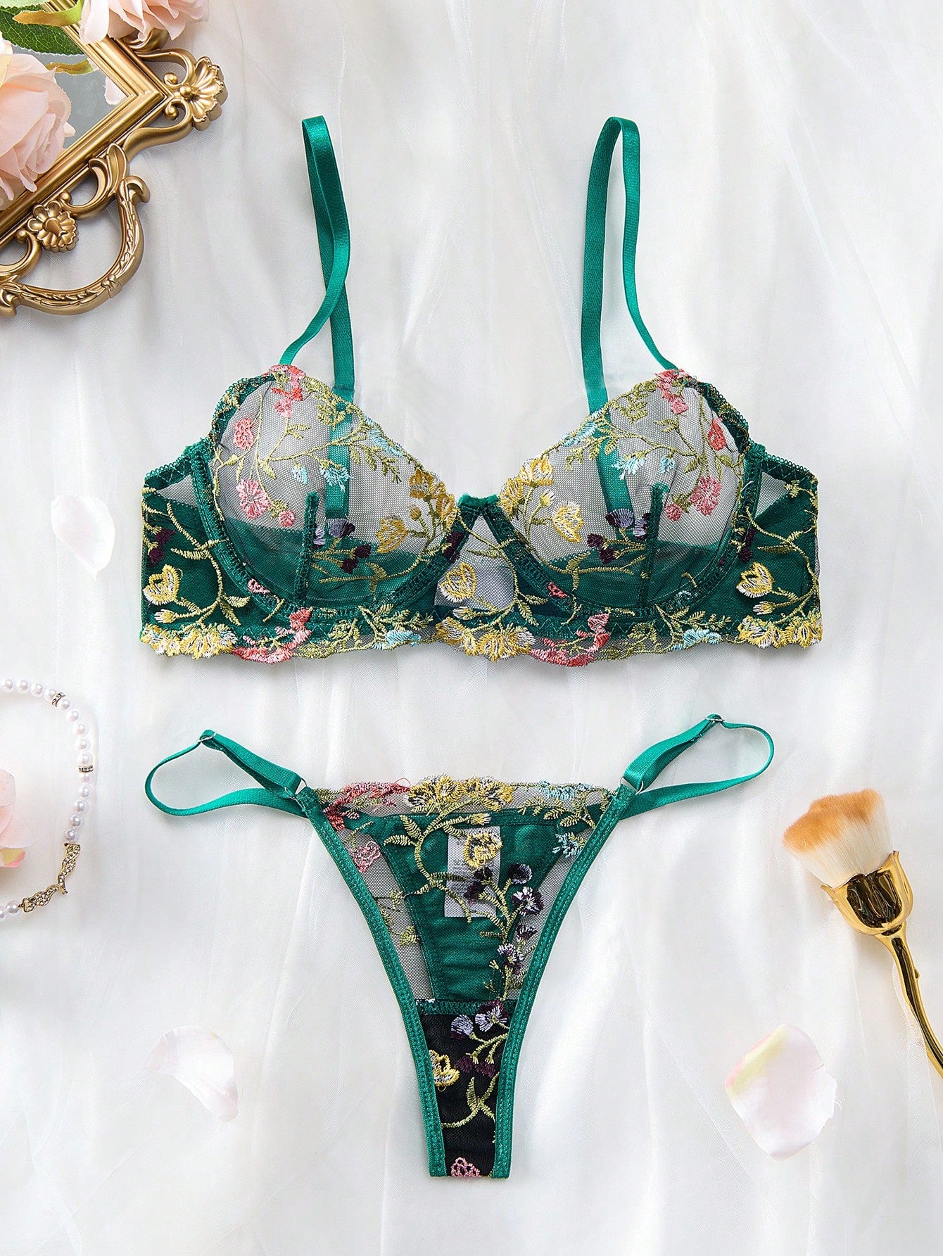Elegancia Natural En Un Conjunto De Lencería Verde Bordado Floral