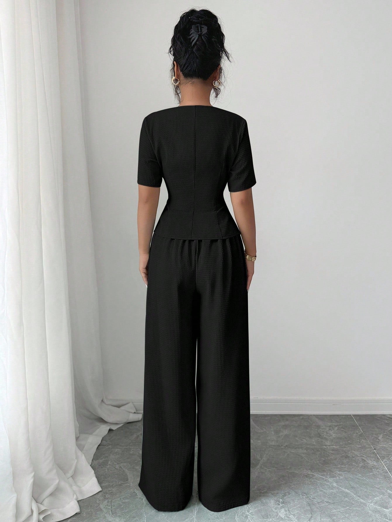 Este conjunto elegante negro está diseñado para mujeres que desean proyectar seguridad, estilo y sofisticación en cada momento. La blusa presenta un escote cuadrado que realza la figura y aporta un toque moderno, acompañado de botones decorativos que añaden distinción. Su estructura con corte peplum estiliza la cintura, creando una silueta definida y favorecedora. El pantalón de pierna ancha complementa el look con un estilo formal y equilibrado, ideal para oficina o eventos donde necesites lucir impecable. Además, su tela tejida aporta textura y calidad, brindando comodidad y durabilidad en el uso diario. Este conjunto es perfecto para reuniones importantes, presentaciones o para elevar tu estilo profesional sin perder comodidad. Un outfit versátil que destaca por su diseño elegante y su acabado impecable.