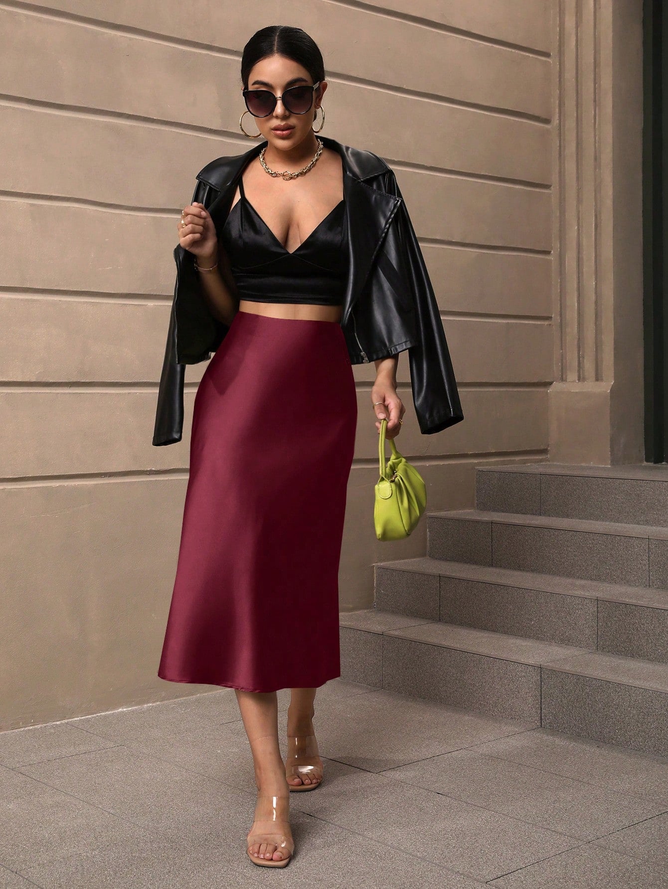Esta falda midi elegante burdeos es la prenda perfecta para quienes buscan un equilibrio entre sofisticación y comodidad. Confeccionada en satén de alta calidad, ofrece un acabado suave y brillante que eleva cualquier look, aportando un aire refinado sin esfuerzo. Su diseño en corte campana con talle alto estiliza la silueta y realza la feminidad, mientras su longitud midi garantiza un estilo moderno y versátil, ideal tanto para la oficina como para salidas de noche. Gracias a su ajuste regular y tejido con ligera elasticidad, se adapta de manera favorecedora sin perder comodidad. El color burdeos intenso le da un toque de elegancia atemporal, fácil de combinar con blusas satinadas, tops minimalistas o chaquetas estructuradas. La cremallera trasera discreta mantiene el diseño pulcro y sofisticado.