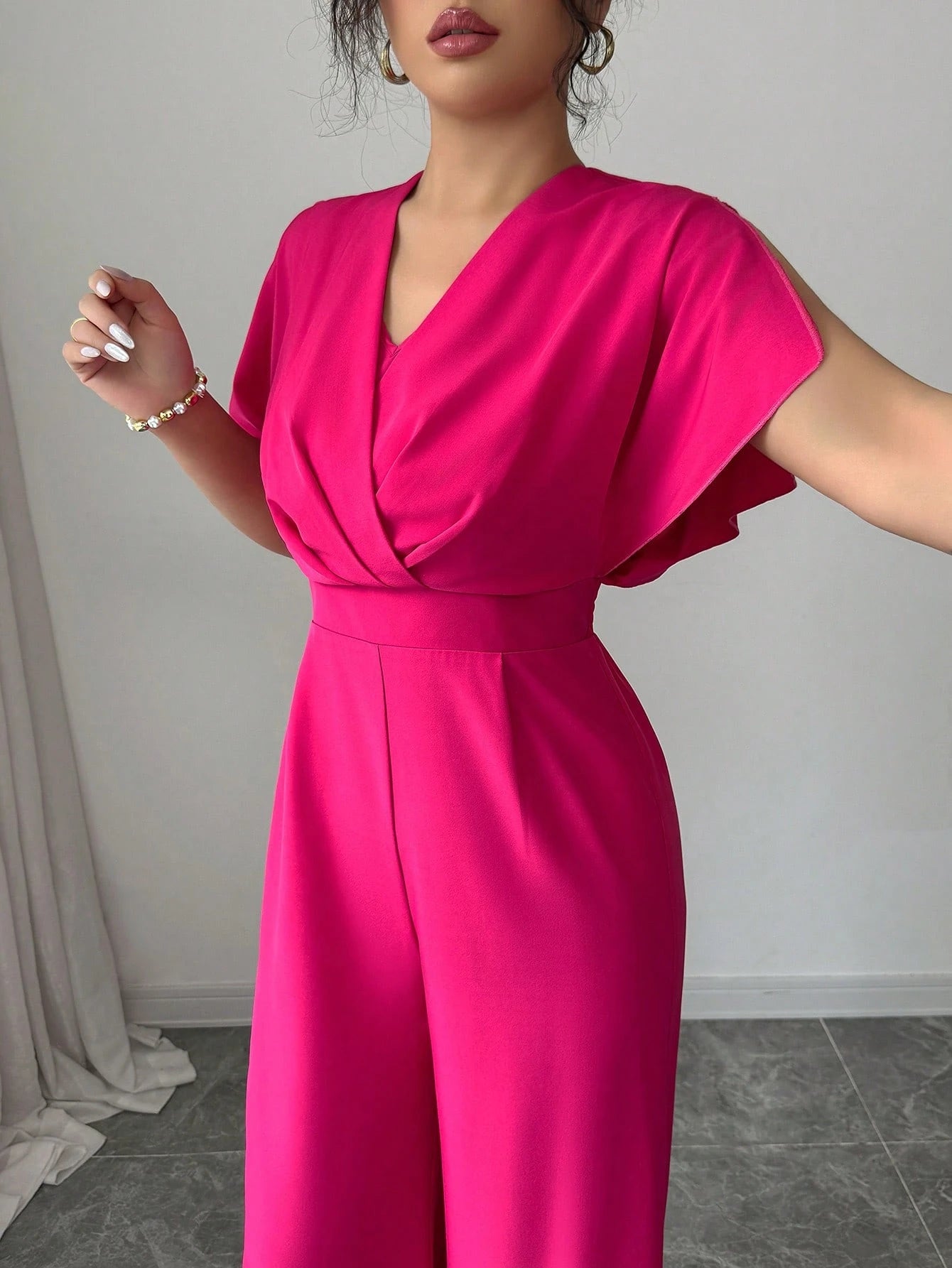 Este jumpsuit rosa fucsia es una pieza diseñada para destacar con personalidad, estilo y sofisticación. Su escote en “V” envolvente aporta un look refinado que enmarca perfectamente el rostro, mientras que las mangas tipo murciélago añaden movimiento y caída suave, generando una silueta moderna y elegante. El talle alto ayuda a estilizar la figura, creando una transición equilibrada hacia un pantalón largo de pierna ancha que aporta fluidez y alarga visualmente las piernas. Gracias a su diseño con pliegues delicados y cierre discreto, la prenda mantiene un acabado limpio y pulido ideal para eventos, cenas especiales o celebraciones formales. Su tejido no elástico pero suave ofrece estructura sin sacrificar comodidad, permitiendo libertad de movimiento. El color rosa fucsia añade un toque vibrante y femenino, perfecto para mujeres que quieren lucir seguras y con presencia en cualquier ocasión.