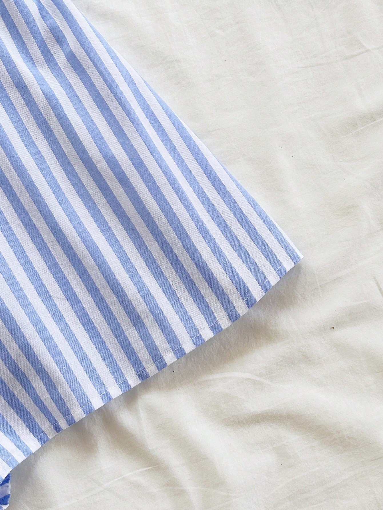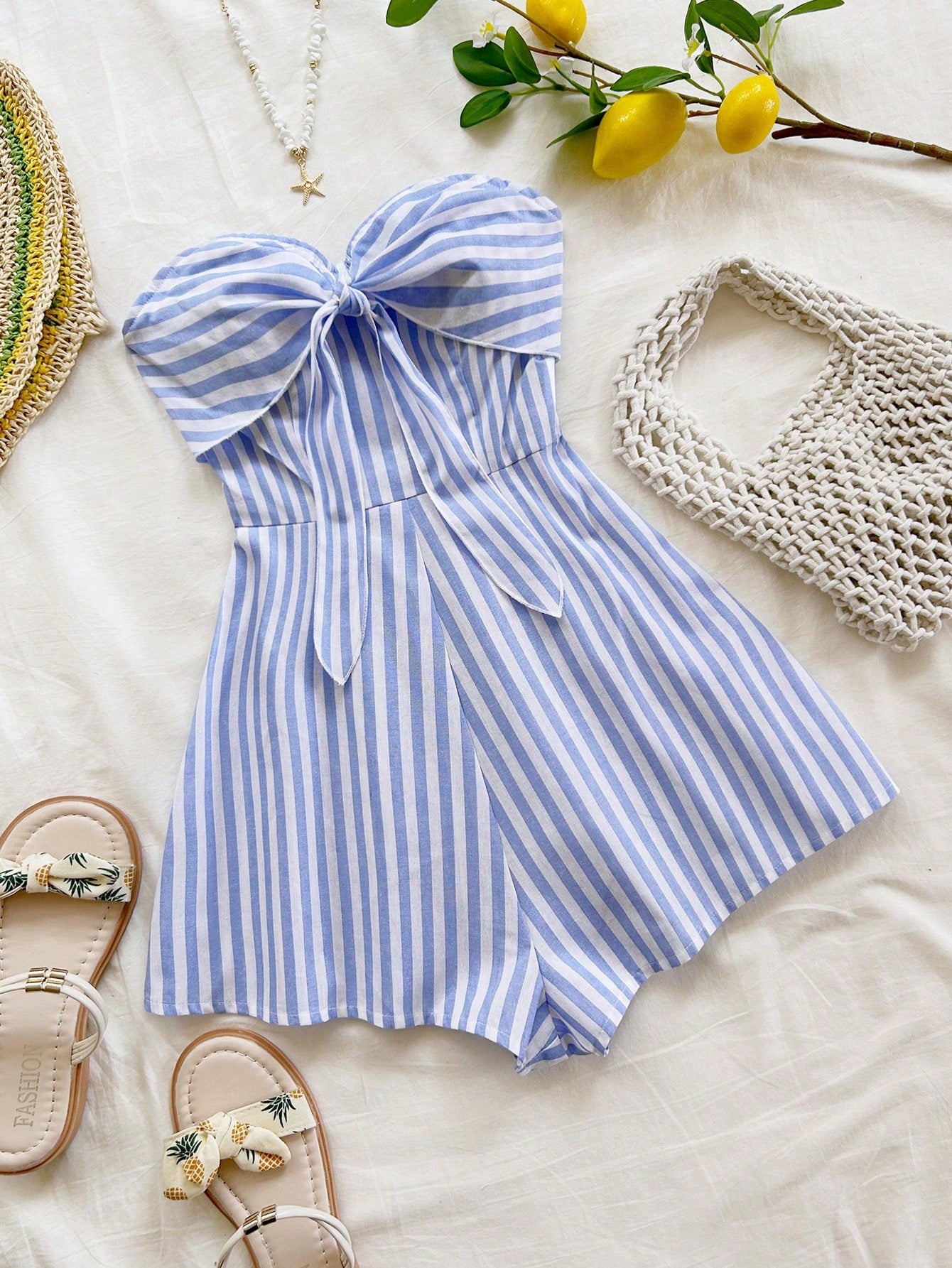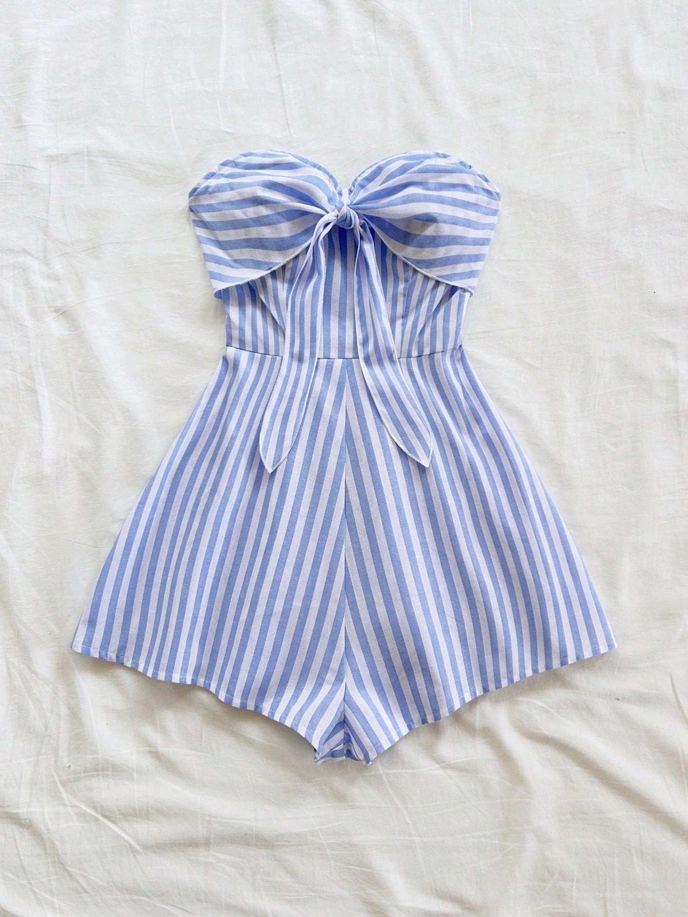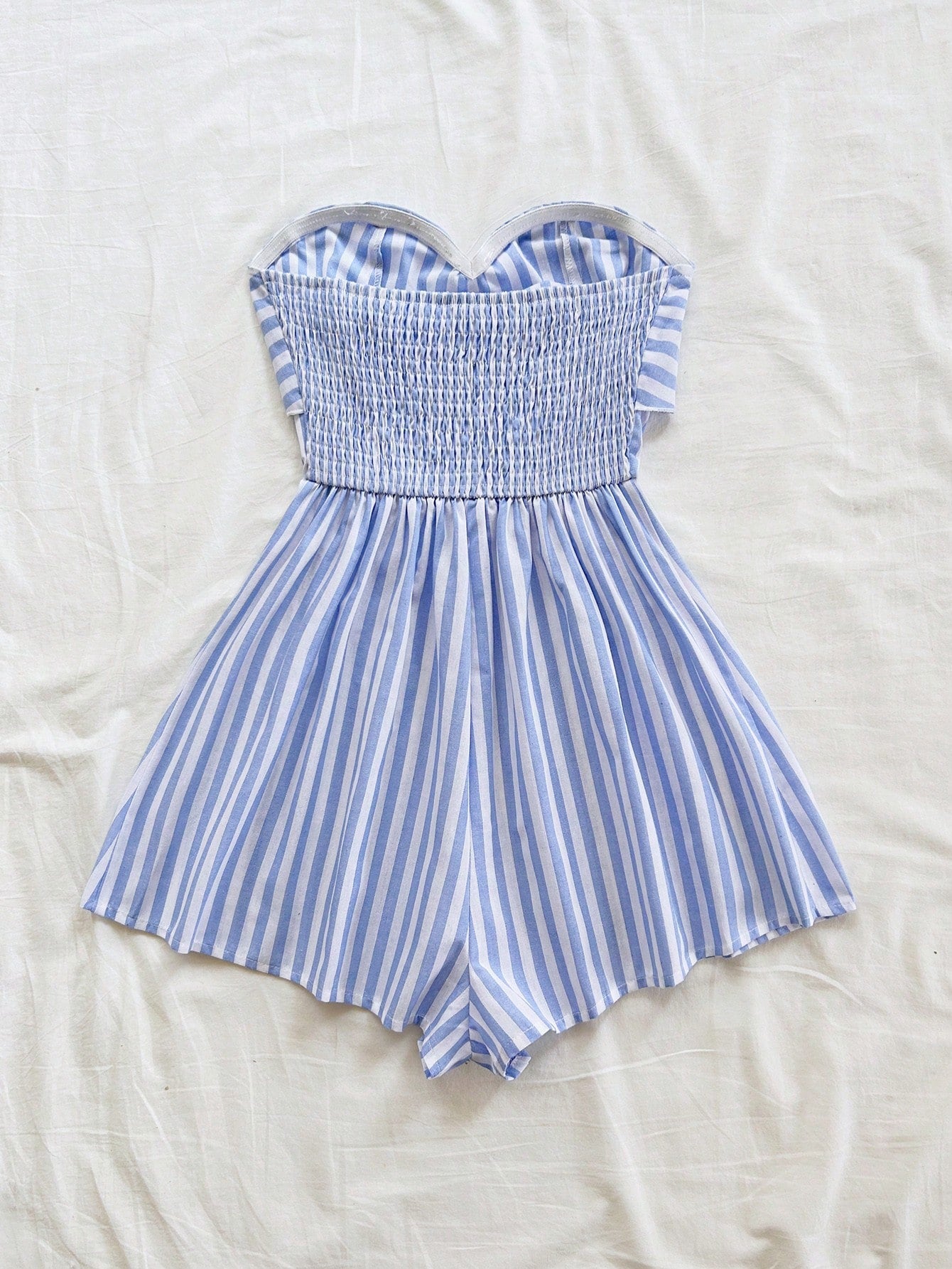 Este mono corto a rayas azul y blanco captura la esencia del verano con un diseño fresco y bohemio que destaca por su elegancia relajada. Su silueta tipo tubo, sin tirantes, realza los hombros y el escote de forma natural, mientras que los pliegues y el fruncido aportan textura y movimiento al diseño. Además, el estampado a rayas verticales estiliza visualmente la figura y crea un look ligero, ideal para días soleados, escapadas a la playa o celebraciones de temporada como carnavales.