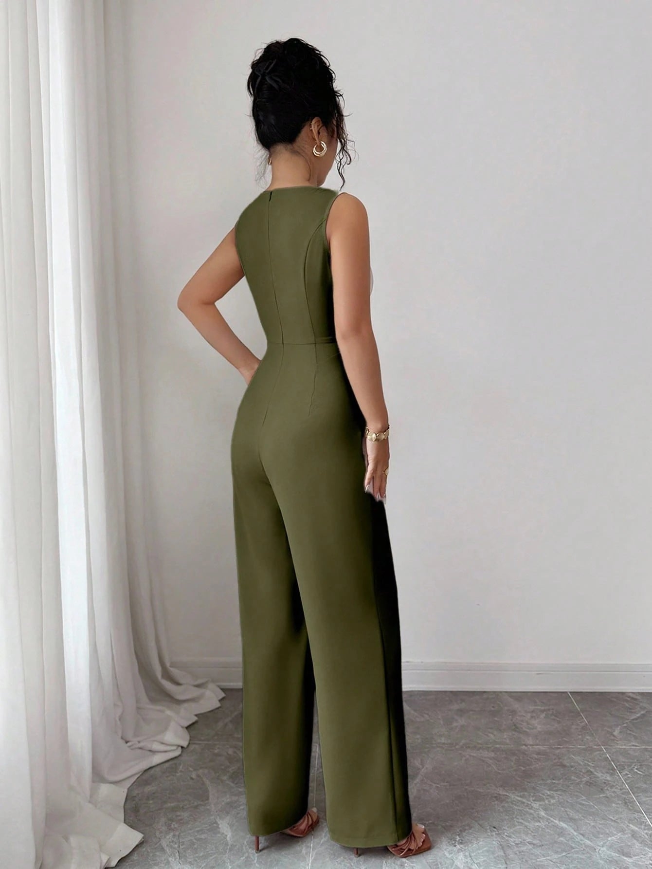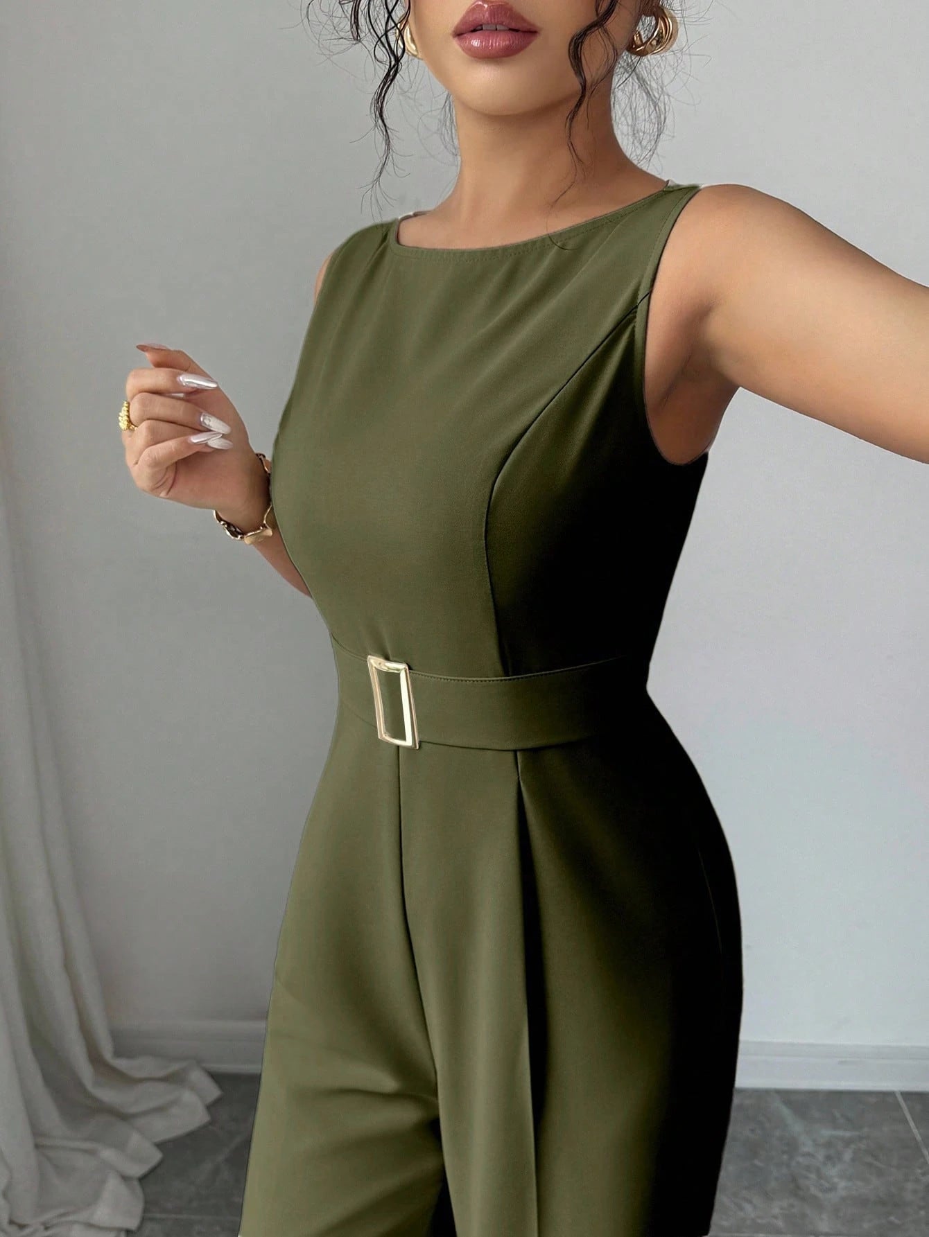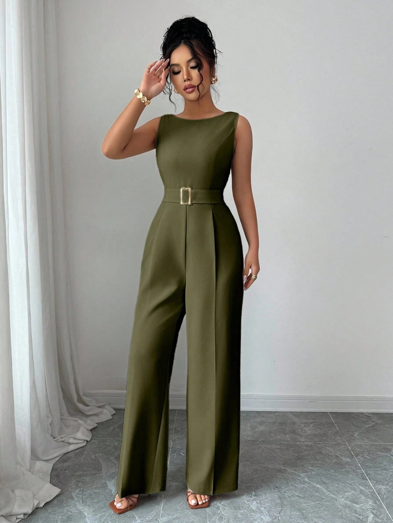 El mono largo elegante verde militar con cinturón redefine la elegancia cotidiana. Su diseño sin mangas con cuello redondo y espalda descubierta crea una silueta limpia y favorecedora, perfecta para destacar con sutileza. El corte de pierna ancha añade fluidez al movimiento, mientras que el cinturón con hebilla dorada resalta la cintura y aporta un acabado refinado. Confeccionado en tela tejida de poliéster de alta calidad, ofrece una estructura firme que mantiene la forma del cuerpo sin perder comodidad. Ideal para looks de oficina, cenas formales o salidas elegantes, este mono combina versatilidad y distinción en un solo diseño. Combínalo con tacones nude y accesorios dorados para un estilo atemporal y lleno de carácter.
