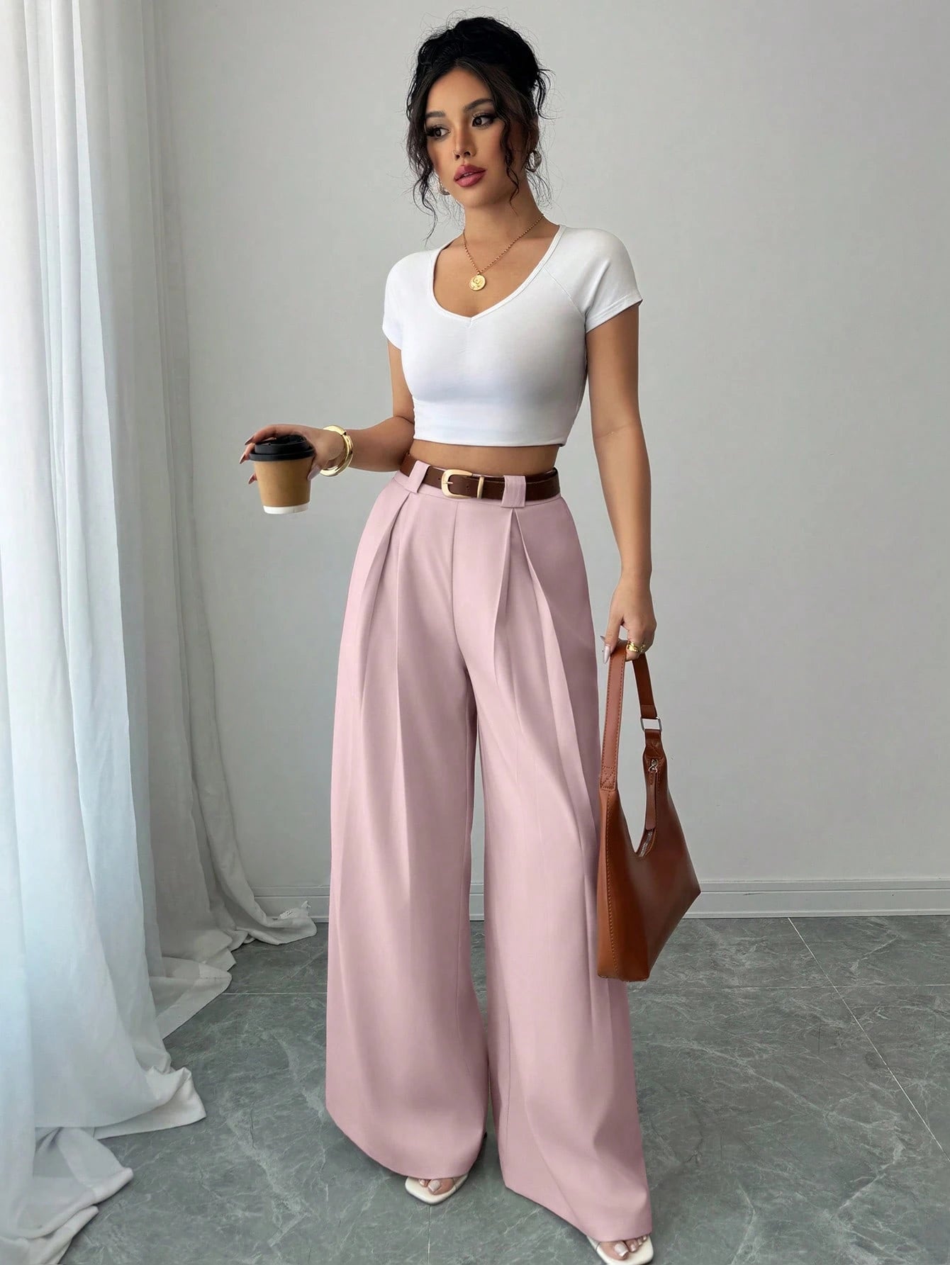 Este pantalón rosa casual de pierna ancha es la prenda perfecta para quienes buscan comodidad y estilo en un mismo look. Su corte fluido y talle natural estilizan la figura mientras aportan un aire moderno y sofisticado, ideal para la temporada de primavera y verano. Los detalles como los bolsillos funcionales, los pliegues frontales y el cierre de cremallera lo convierten en una pieza práctica y elegante, adaptable tanto para salidas casuales como para eventos especiales. Su color rosa transmite frescura y feminidad, permitiendo múltiples combinaciones con blusas, camisas o tops ajustados.