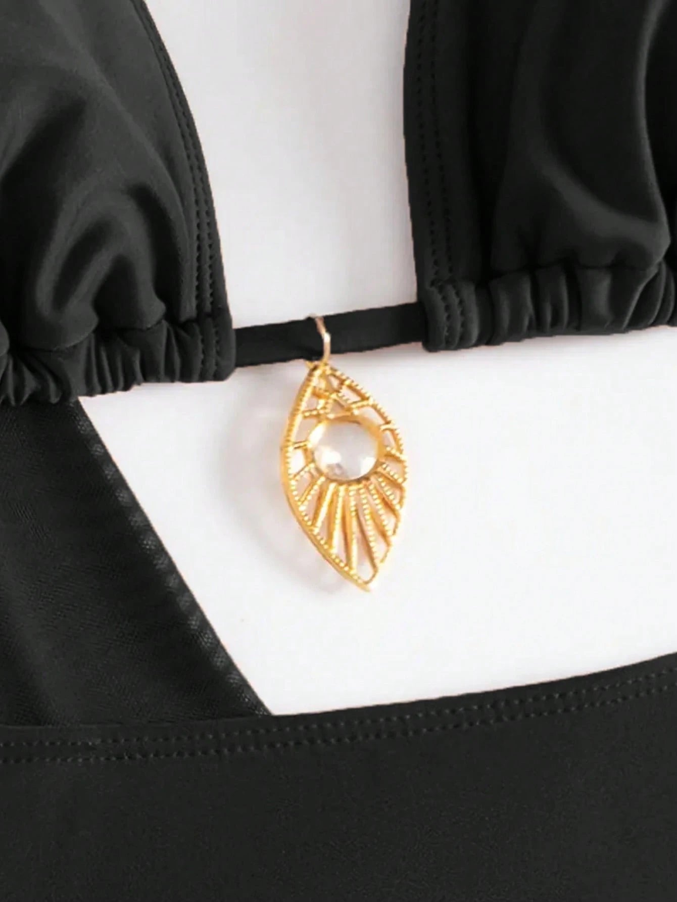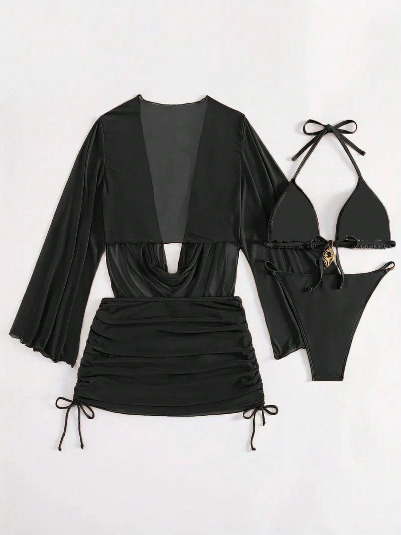 El Set Bikini Negro Con Falda Y Cárdigan De Playa Elegante es una propuesta sofisticada y versátil pensada para mujeres que desean lucir impecables antes, durante y después de un día bajo el sol. Desde el primer instante, este conjunto destaca por su diseño coordinado en color negro liso, el cual aporta un aire elegante y favorecedor que nunca pasa de moda. Además, la combinación de bikini, falda corta fruncida y cárdigan de manga larga crea un look completo que se adapta con facilidad a diferentes momentos de tus vacaciones.