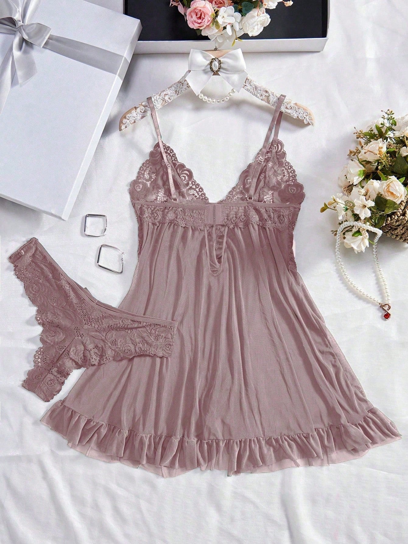 Negligé De Encaje Caqui Con Volante Y Lazo
