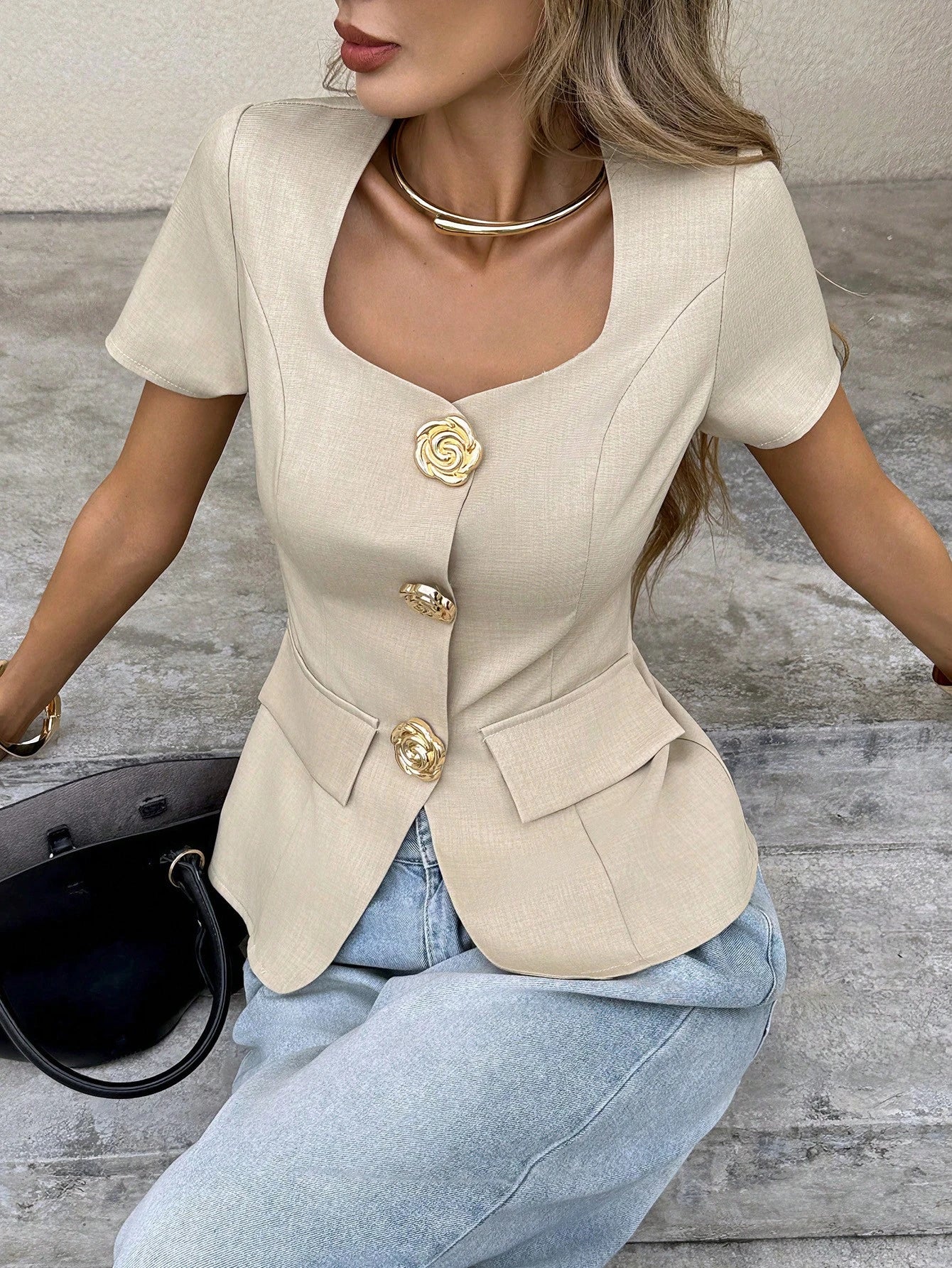 El top albaricoque con botones dorados y escote cuadrado es una pieza elegante y versátil que combina la sutileza del color con el lujo de los detalles. Su estructura entallada realza la figura con un ajuste favorecedor, mientras que los botones dorados en forma de flor aportan un toque refinado y moderno. Perfecto para crear looks de oficina con estilo o para elevar tus outfits casuales con un aire distinguido. Confeccionado en 98% poliéster y 2% elastano, su tejido no elástico mantiene la forma ideal durante todo el día, ofreciendo una silueta pulida y elegante. Su escote cuadrado resalta el cuello con delicadeza, y la manga corta brinda comodidad en cualquier temporada. Combínalo con pantalones de mezclilla o faldas midi para un look sofisticado y atemporal.