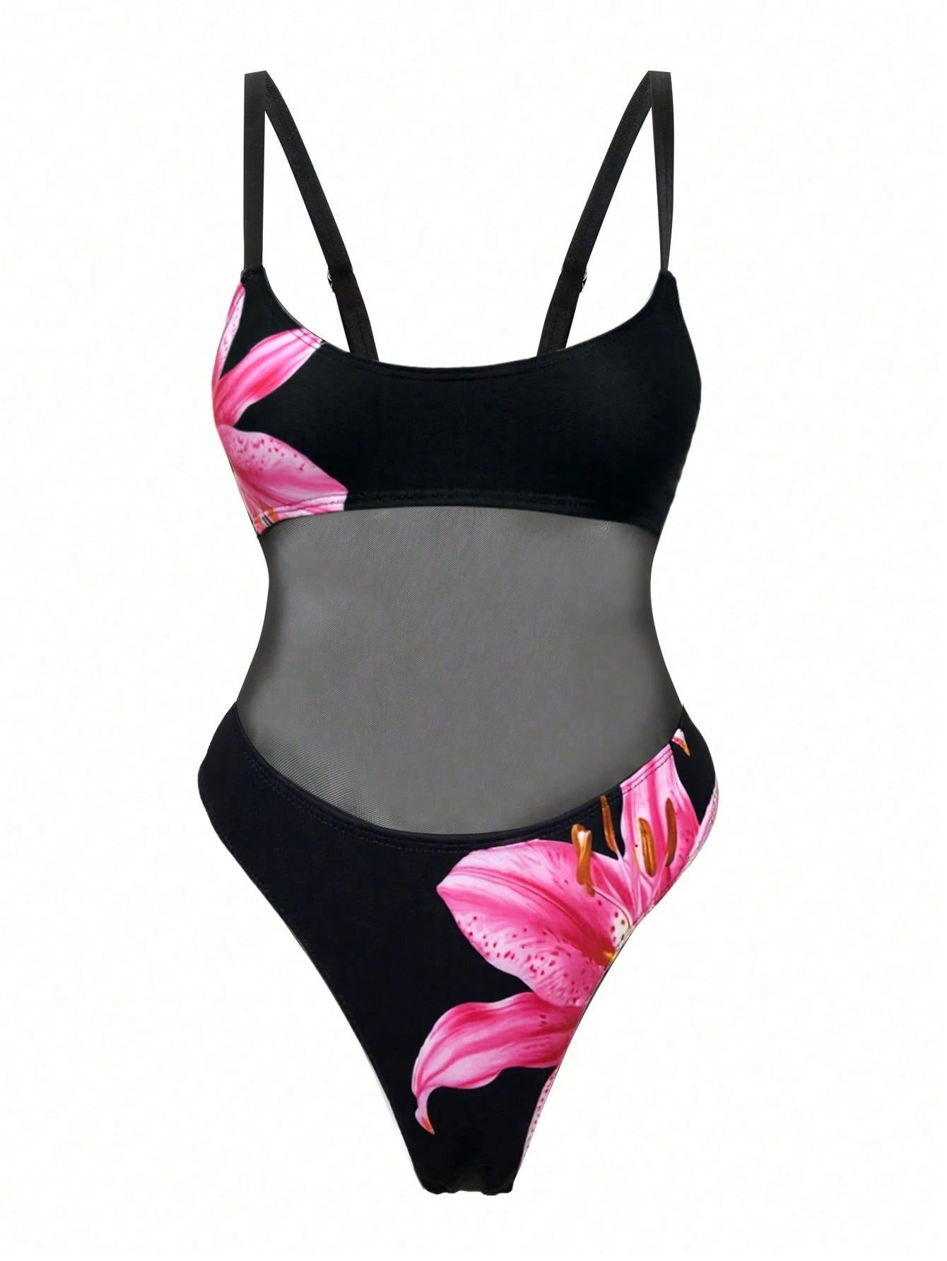 El Traje De Baño Negro Sexy Con Transparencia es una pieza diseñada para resaltar la figura con un estilo moderno, elegante y atrevido. Este modelo combina un escote con tirantes finos y un panel frontal de malla que aporta un toque de sensualidad sofisticada, mientras las flores rosadas en contraste añaden un detalle vibrante y femenino. Gracias a su corte alto, estiliza visualmente las piernas y define la silueta de forma armoniosa.