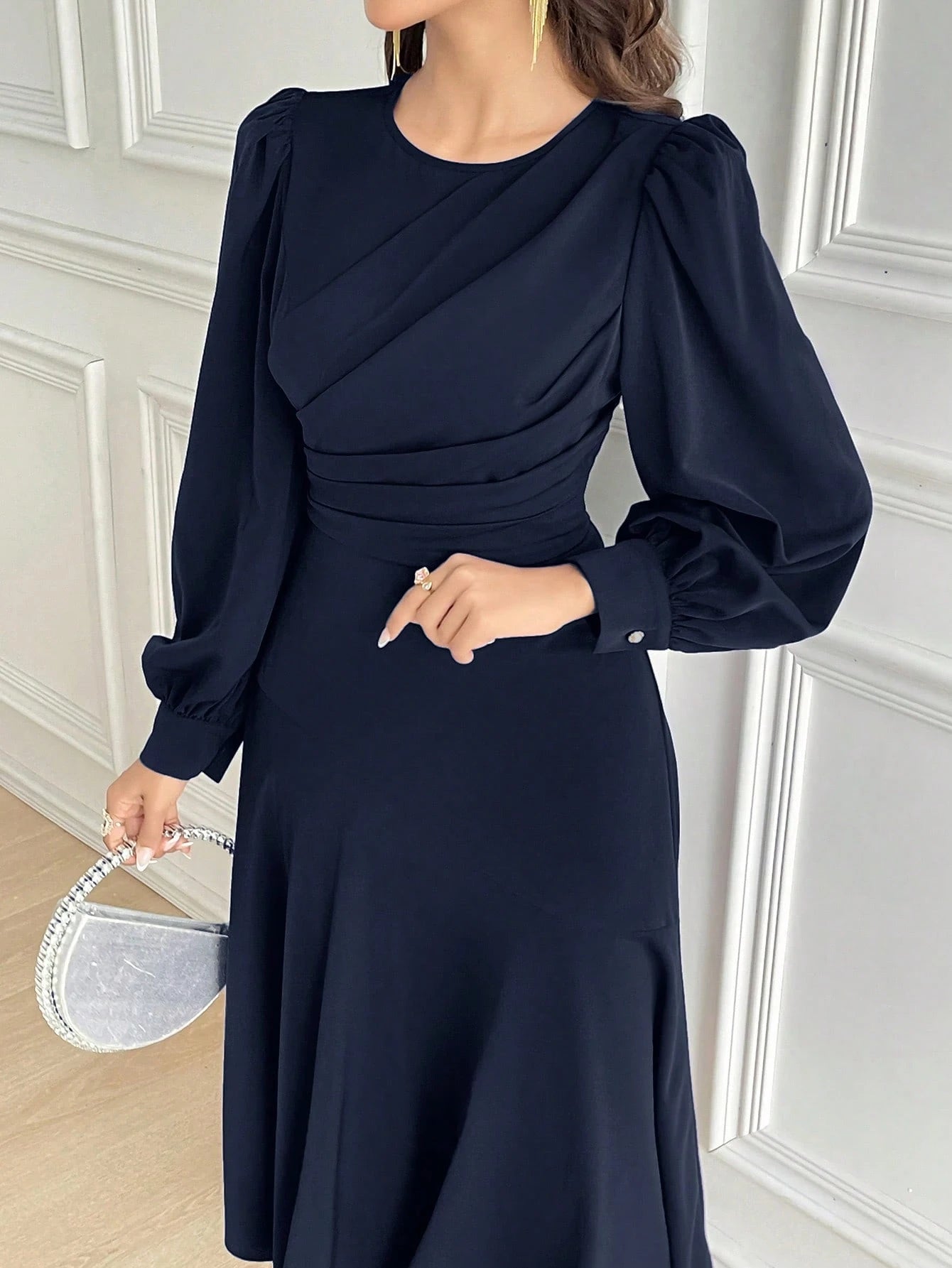 Este vestido azul marino elegante manga obispo es una pieza creada para destacar con distinción en eventos formales, noches especiales y ocasiones donde deseas proyectar clase y estilo. Su diseño A línea alarga visualmente la figura y ofrece un movimiento fluido gracias a su bajo en campana, lo que aporta un toque de delicadeza en cada paso. Además, el escote redondo y los pliegues fruncidos en la parte superior crean una armonía visual que estiliza la zona del pecho y aporta sofisticación al conjunto.