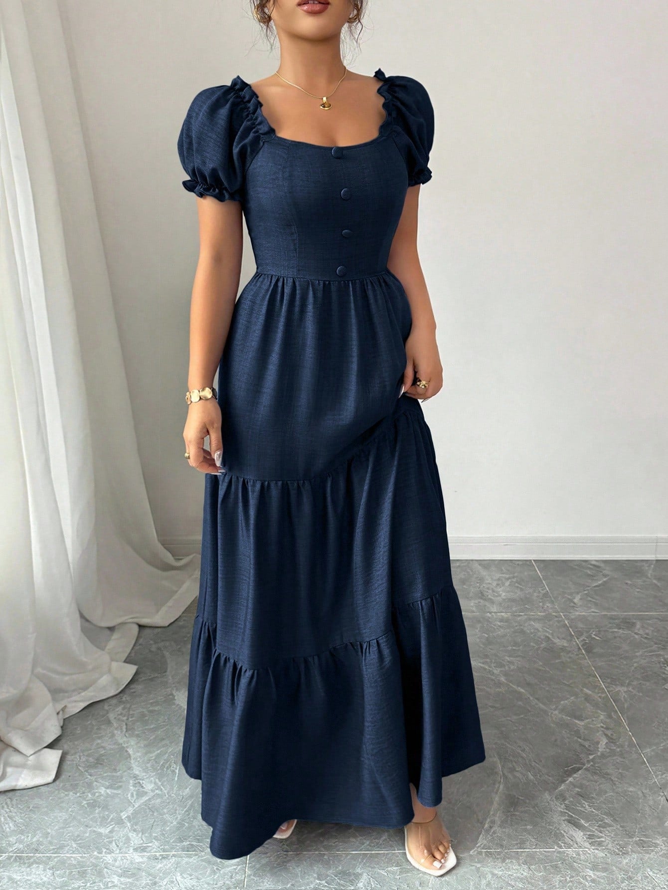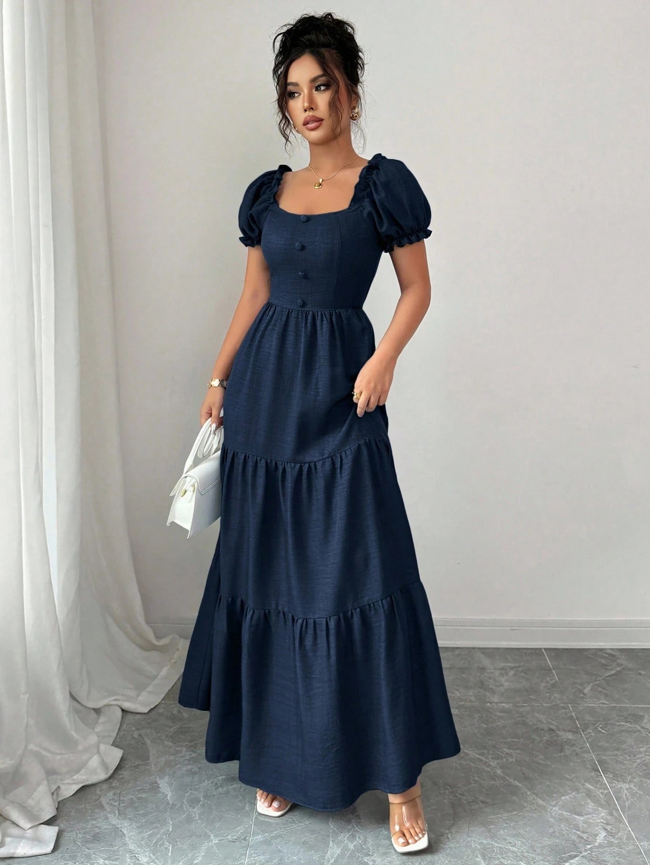 El vestido azul marino largo con manga farol y escote cuadrado combina elegancia, feminidad y un estilo atemporal que resalta la silueta de forma sutil. Su diseño de corte A línea con talle alto estiliza la figura, mientras los volantes en capas aportan movimiento y un toque romántico. Las mangas farol añaden volumen y sofisticación, haciendo de este vestido una opción ideal para bodas, cenas o eventos formales.