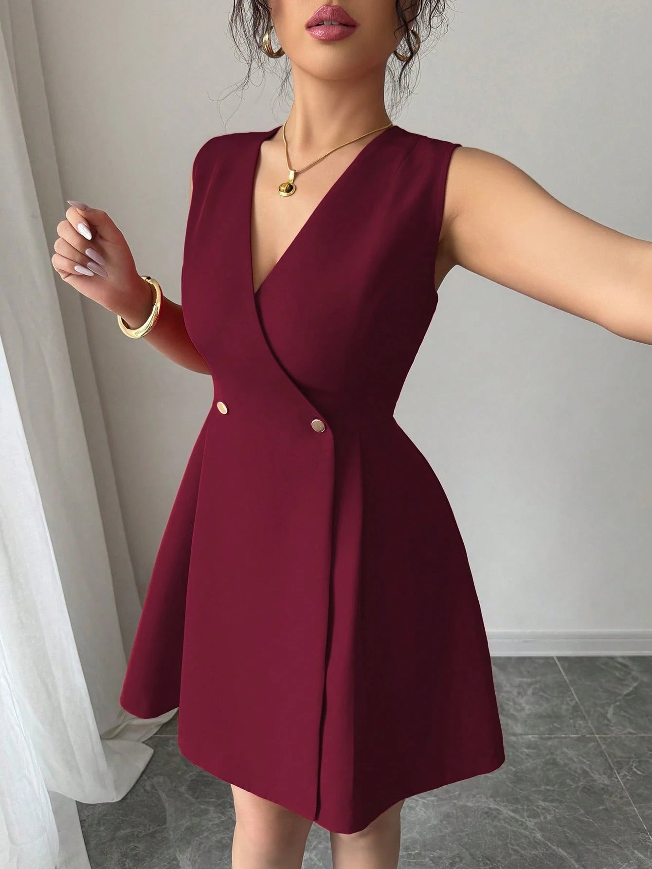 Este vestido burdeos elegante a línea sin mangas es una pieza diseñada para resaltar tu figura con un estilo sofisticado y contemporáneo. Su corte envolvente crea un efecto visual estilizado, mientras que la doble botonadura frontal añade un toque clásico que eleva por completo la prenda. Además, el escote en “V” aporta feminidad sin perder la esencia profesional del diseño.