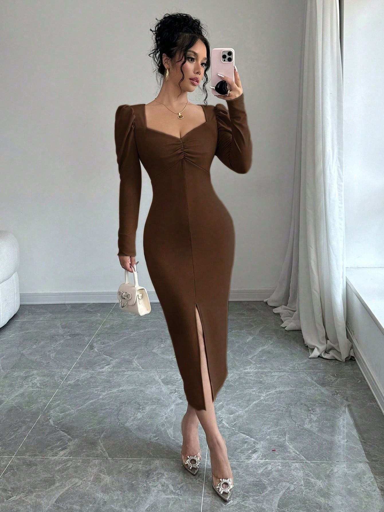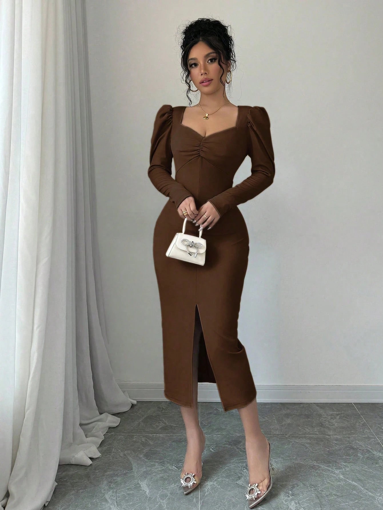 Este vestido café elegante con manga abullonada y abertura midi redefine el glamour moderno. Su corte ajustado realza la silueta con elegancia, mientras el escote corazón y el detalle fruncido en el pecho aportan un toque femenino irresistible. El diseño de manga larga abullonada crea una estructura sofisticada, perfecta para eventos, oficina o cenas especiales. Elaborado en tela tricotada de alta calidad, con un 95% de poliéster y 5% de elastano, brinda un ajuste cómodo y favorecedor gracias a su estiramiento medio. La abertura frontal aporta movimiento y sensualidad sin perder la sobriedad característica del estilo DAKARI.