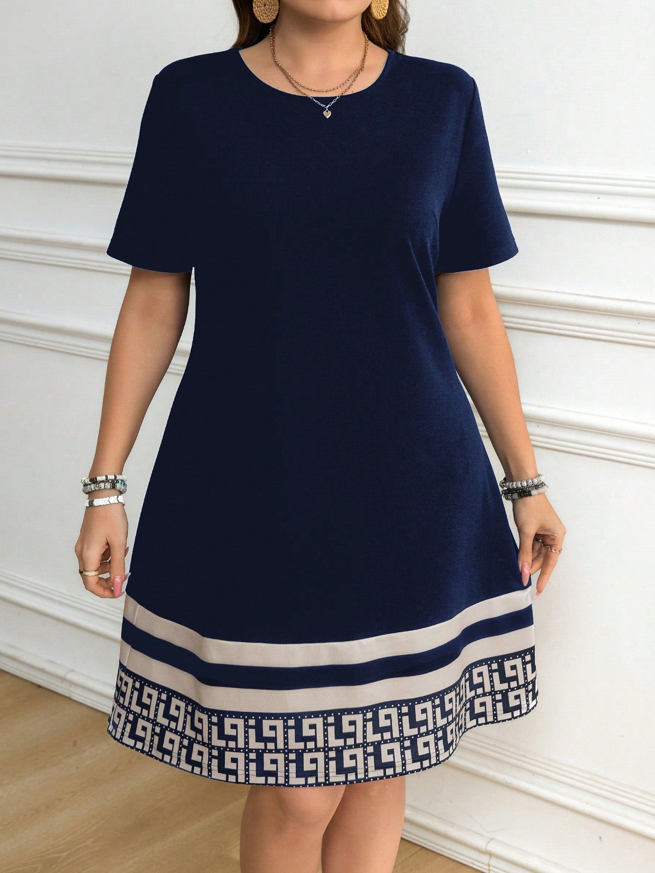 El vestido casual azul marino con estampado geométrico es la prenda perfecta para quienes buscan elegancia sin esfuerzo. Su diseño A línea con corte recto y talle natural ofrece una silueta relajada que se adapta con suavidad al cuerpo, ideal para el uso diario o para estar cómoda en casa. El estampado en tonos combinados con líneas y detalles de inspiración griega en el bajo aporta un toque moderno y distintivo, mientras que su tejido tricotado con estiramiento medio garantiza confort y libertad de movimiento.