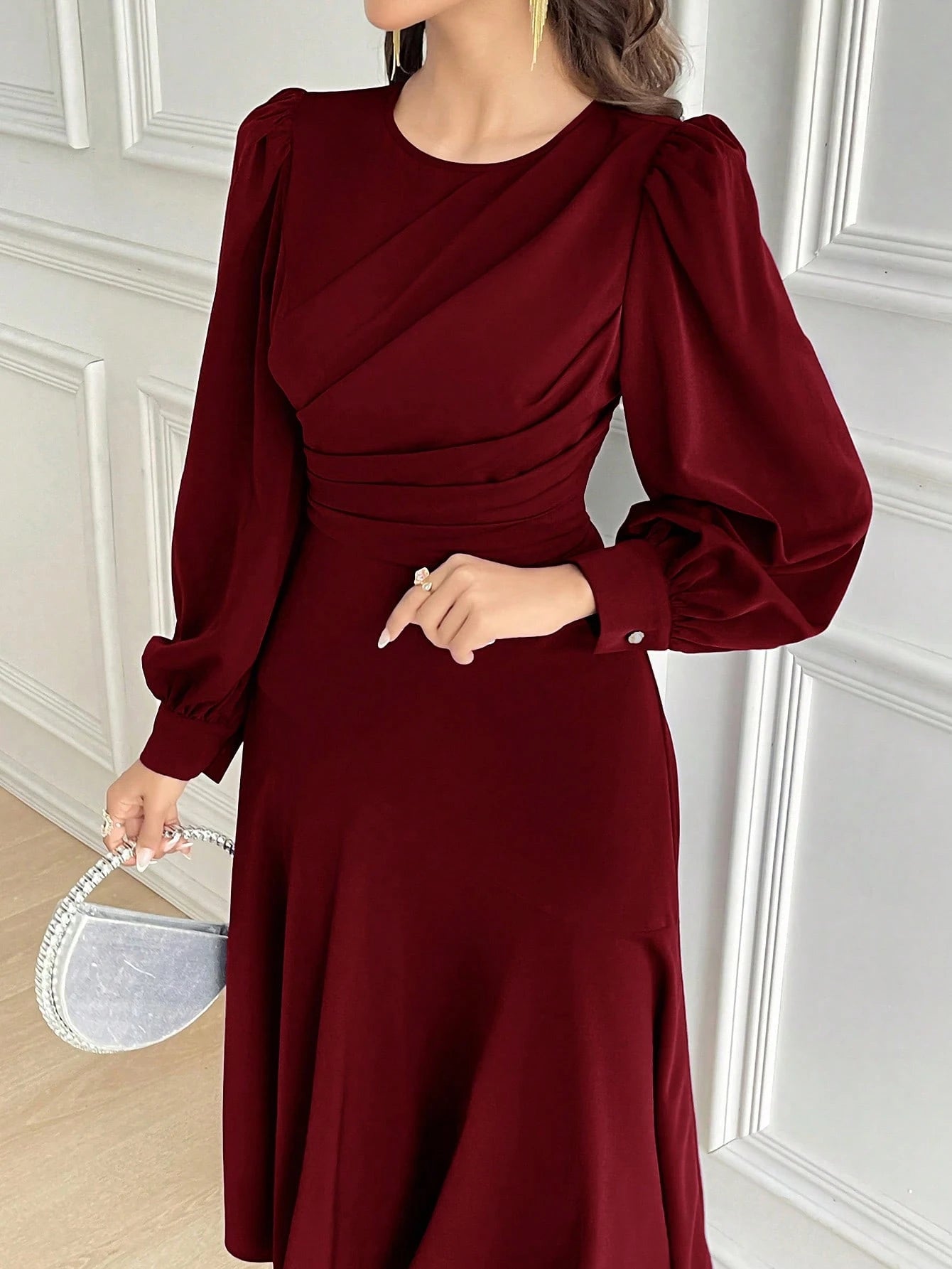 El Vestido Elegante Burdeos A Línea Manga Obispo Para Mujer es una pieza diseñada para destacar por su estilo refinado y su silueta impecable. Su tonalidad burdeos aporta un aire de lujo sutil, ideal para ocasiones formales o eventos de noche donde quieras lucir sofisticada sin perder comodidad. Además, su parte superior incorpora frunces delicadamente colocados para estilizar el torso, mientras que la falda de corte campana proyecta movimiento y fluidez con cada paso.
