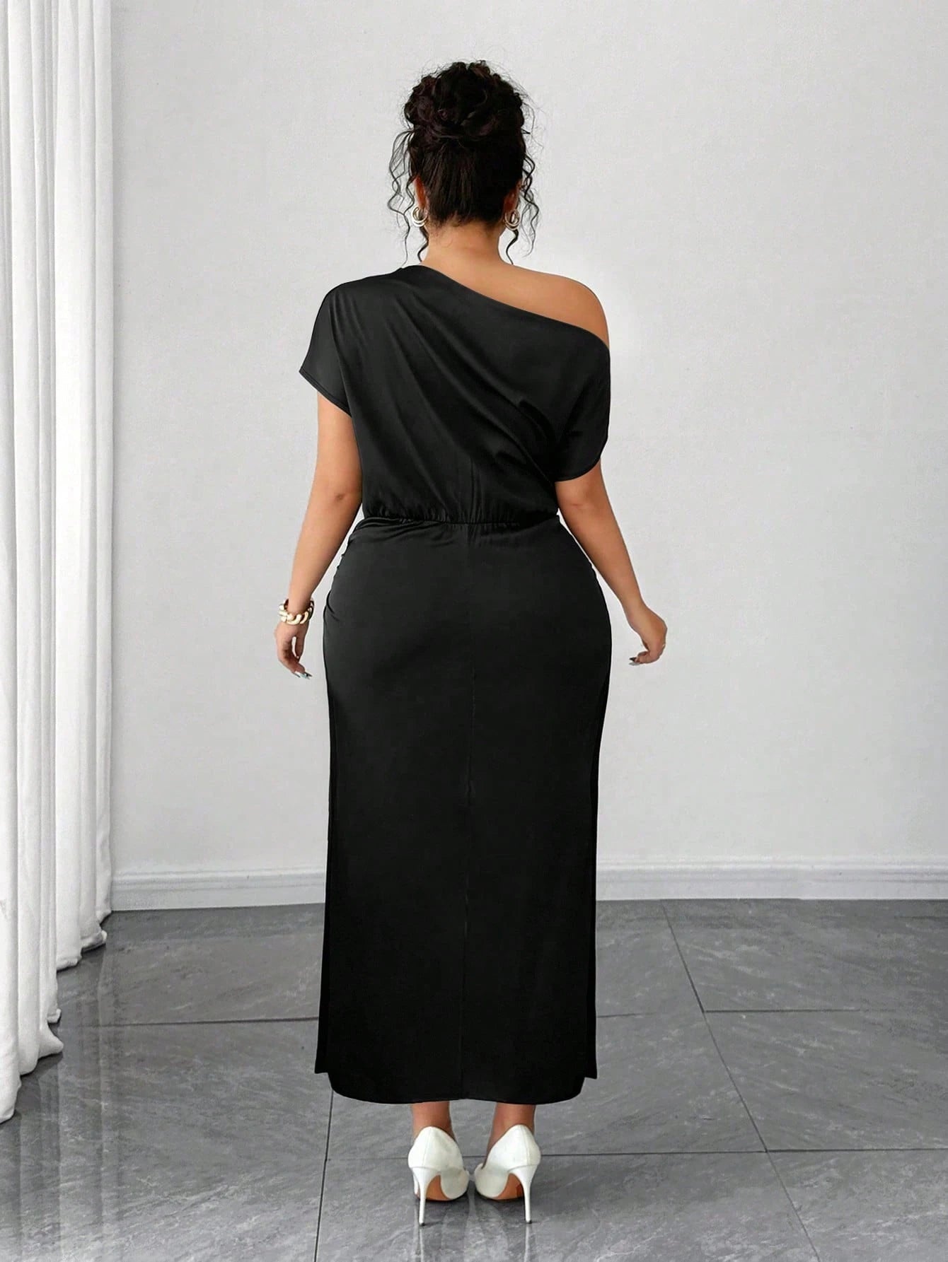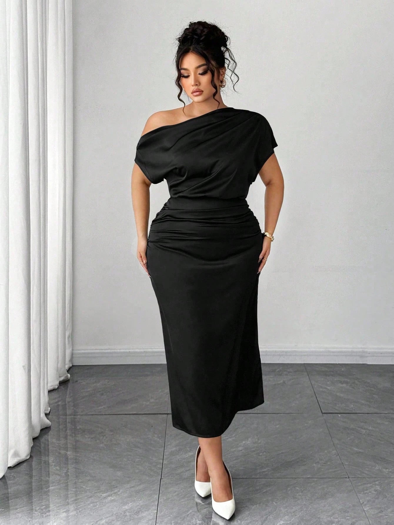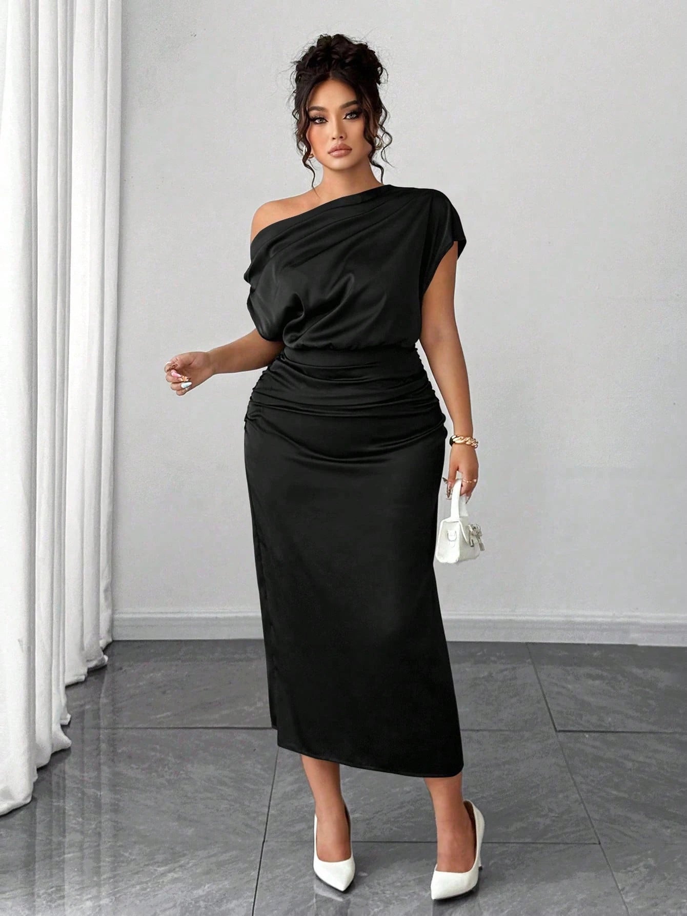 Este vestido elegante negro asimétrico midi es la elección perfecta para eventos donde la elegancia y el estilo se combinan en una sola prenda. Su cuello asimétrico y manga murciélago aportan un toque sofisticado y moderno, mientras que su corte ajustado y el fruncido lateral realzan la silueta con un efecto favorecedor. Confeccionado en tela tejida no elástica, ofrece una caída impecable que resalta la figura sin perder comodidad. Ideal para bodas, cenas formales o celebraciones especiales, este vestido proyecta confianza y glamour en cada paso. Combínalo con tacones clásicos y accesorios dorados para un look inolvidable que nunca pasa desapercibido.