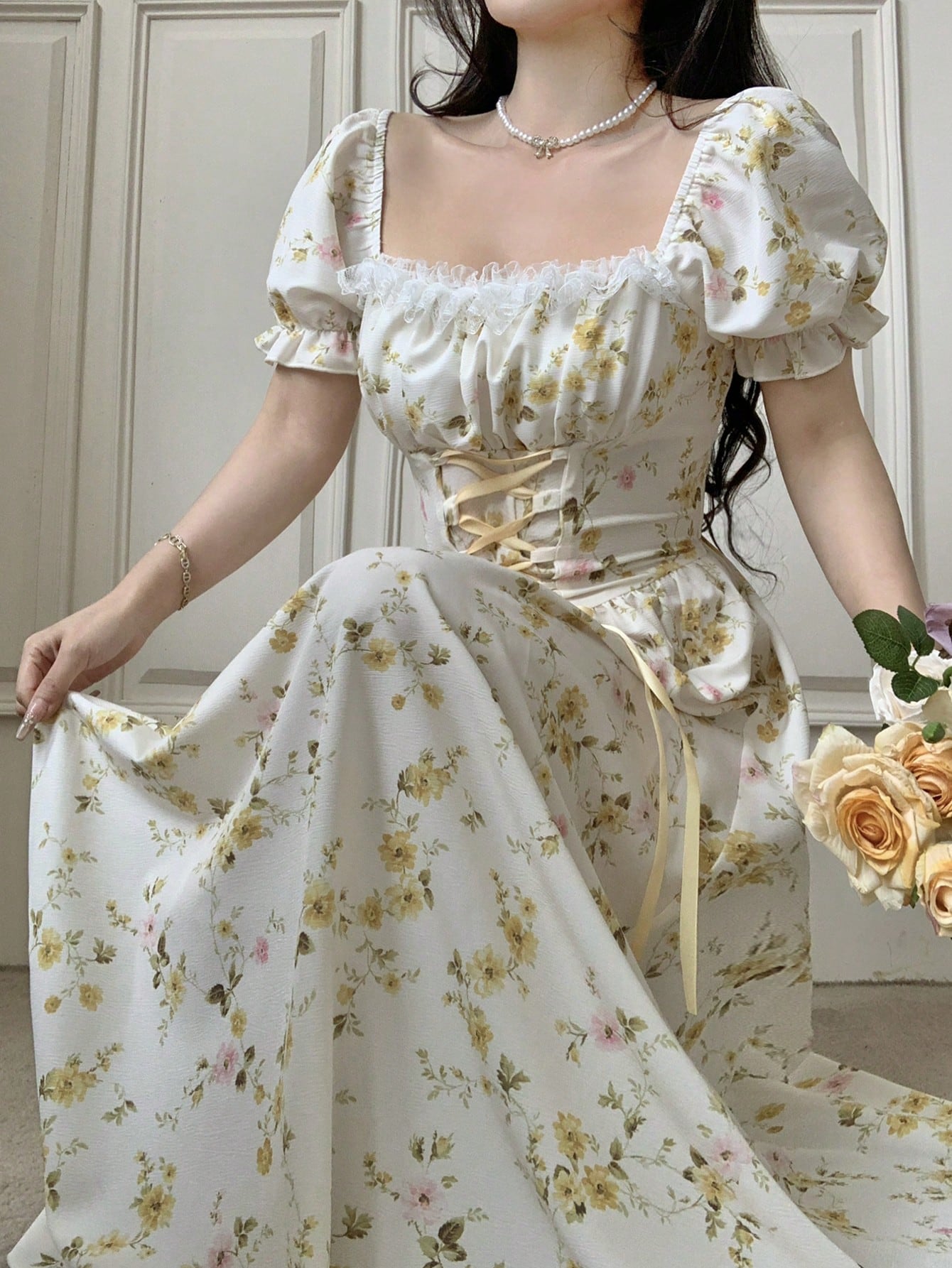 Este vestido floral midi con manga farol combina estilo bohemio, detalles románticos y una silueta favorecedora que resalta la feminidad en cada movimiento. Su estampado integral de flores amarillas y rosadas sobre fondo claro transmite frescura y suavidad, ideal para días soleados, brunches, caminatas al aire libre o sesiones fotográficas especiales. Además, el escote cuadrado con volantes fruncidos aporta un toque delicado, mientras que el diseño anudado en la cintura simula un corset elegante que define la silueta de manera natural sin perder comodidad.