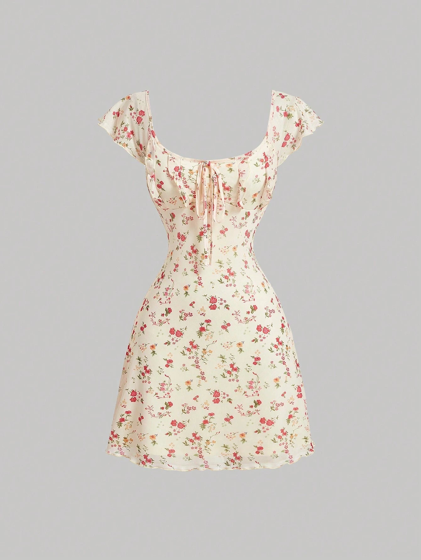 Este vestido corto floral está diseñado para resaltar tu figura con un estilo delicado, femenino y moderno. Su escote scoop con lazada frontal aporta un toque romántico, mientras que el pecho fruncido y el nudo decorativo crean una apariencia estilizada y armoniosa. Además, el corte A línea y el talle alto definen la cintura y brindan un movimiento suave al caminar. Por otro lado, las mangas capa estilo raglán añaden un detalle bohemio y elegante que lo hace perfecto para días cálidos, graduaciones, eventos de inicio de temporada o salidas casuales con un toque especial.