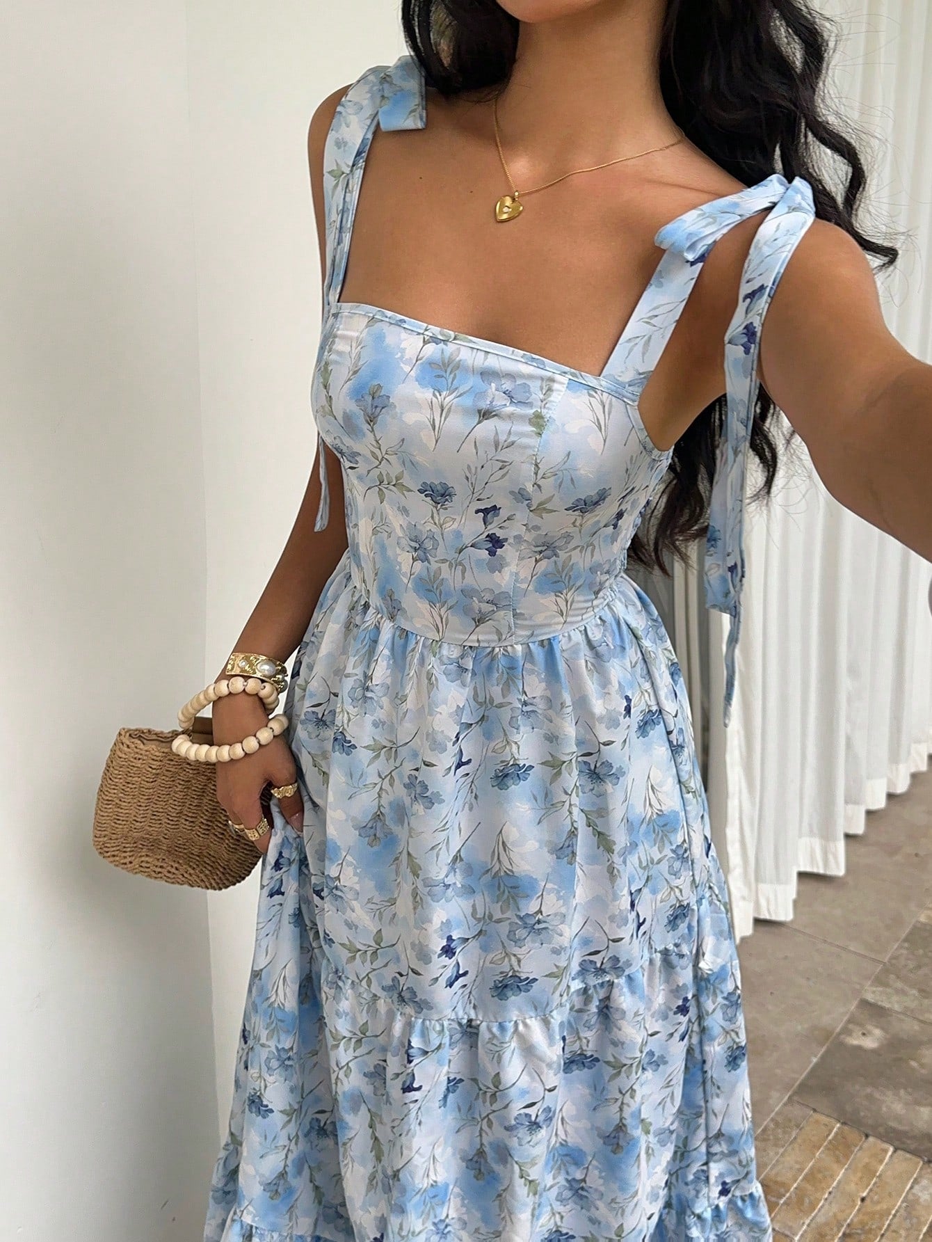 Este vestido largo azul y blanco de tirantes con volantes es la prenda ideal para quienes buscan un estilo natural, femenino y relajado. Su estampado floral en tonos suaves transmite un aire romántico perfecto para días soleados o escapadas a la playa. El diseño ajustado al pecho con nudo y fruncido realza la figura, mientras el bajo con volantes añade movimiento y un toque coqueto al caminar. Confeccionado en tela tejida no elástica, ofrece comodidad y ligereza, ideal para el verano. Las tiras anchas se ajustan con lazo, aportando un detalle encantador y versátil. Sin forro, este vestido es fresco y transpirable, ideal para climas cálidos. Combínalo con sandalias y un bolso de rafia para un look casual y chic digno de DAKARI.