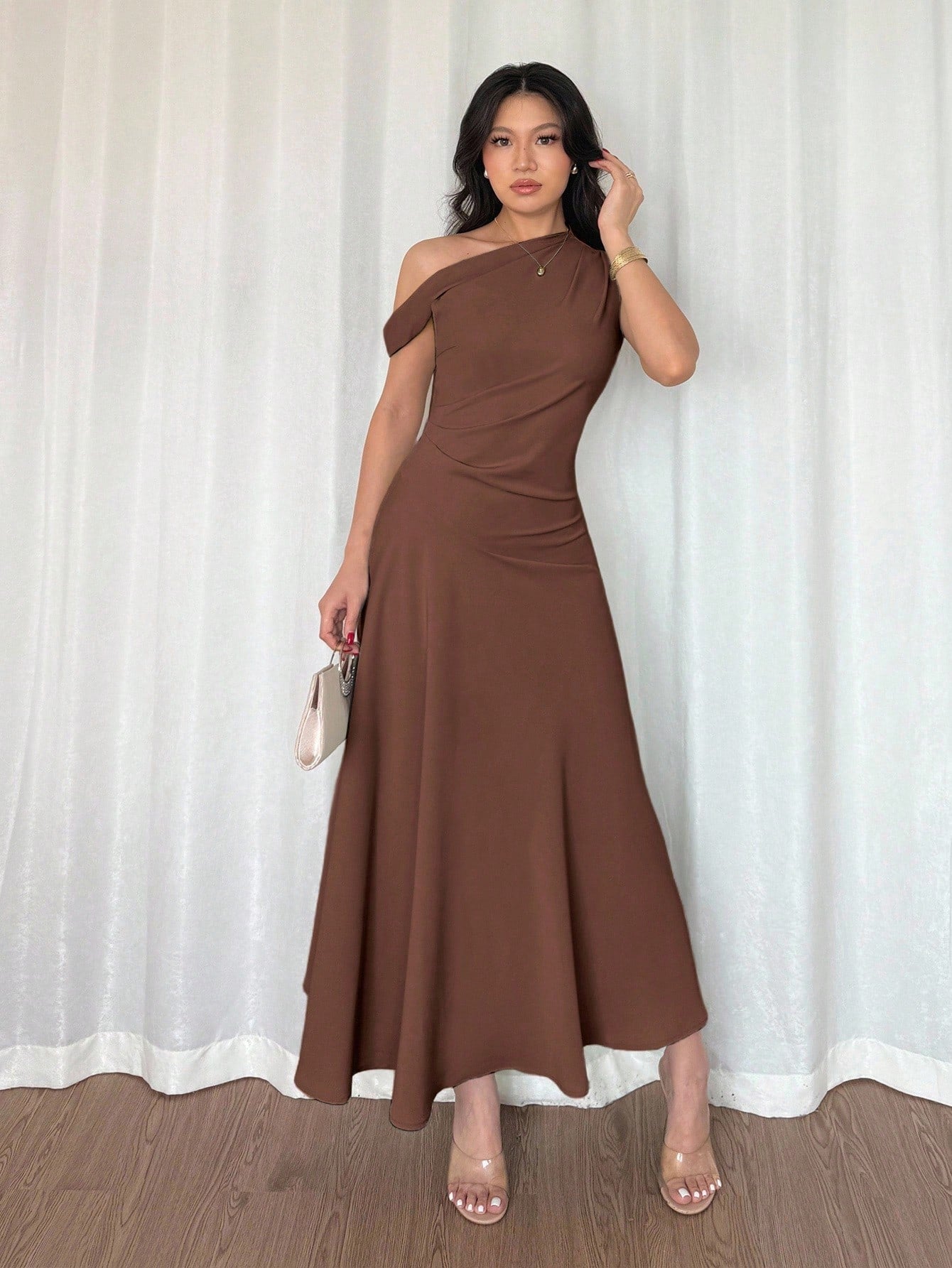 Este vestido largo elegante café es ideal para quienes buscan destacar con estilo en ocasiones formales y eventos de noche. Con un escote asimétrico y mangas tipo capa, aporta un aire sofisticado y diferente que realza la feminidad. Su silueta en corte A línea y bajo campana estiliza la figura, ofreciendo un movimiento fluido y elegante en cada paso.El diseño incluye detalles fruncidos que aportan textura y un ajuste favorecedor, mientras la cremallera discreta asegura comodidad y un acabado impecable. Confeccionado en tela tejida 100% poliéster, es resistente y ligero, pensado para ofrecer frescura sin perder estructura. El tono café transmite sobriedad y elegancia, convirtiéndose en una opción atemporal que combina a la perfección con accesorios dorados, tacones de tiras finas o bolsos de mano en tonos metálicos.