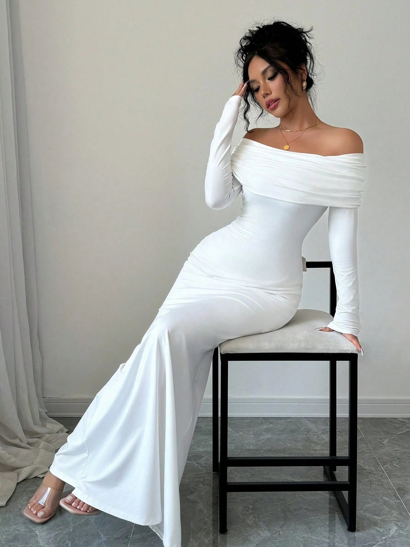El Vestido largo elegante con hombros perfecto para destacar en cualquier evento elegante. Este vestido largo elegante es la definición de sofisticación y estilo. Con un diseño ajustado que resalta la figura, combina un escote de hombros descubiertos con detalles fruncidos que le otorgan un toque moderno y femenino. La tela tricotada de alta elasticidad asegura un ajuste cómodo mientras define las curvas de manera favorecedora.