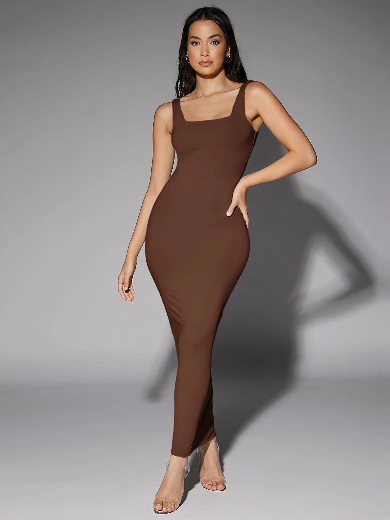 Si buscas una prenda que combine sofisticación, estilo minimalista y un ajuste impecable, este Vestido Marrón Elegante es la opción ideal. Diseñado para resaltar cada curva con un acabado limpio y moderno, ofrece un look estilizado y femenino sin esfuerzo. Además, gracias a su tejido de elasticidad alta, se adapta al cuerpo con suavidad y comodidad, permitiéndote moverte con seguridad y confianza. Su largo maxi y su silueta tipo lápiz aportan un toque refinado, mientras que el escote scoop y los tirantes amplios mantienen un estilo sobrio y perfectamente equilibrado.