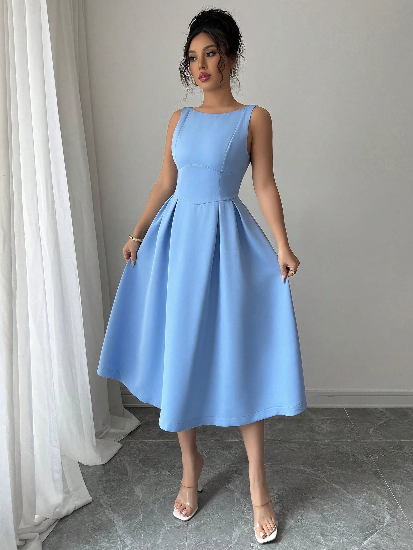 Si estás buscando una pieza refinada y femenina, este vestido midi azul elegante será tu elección perfecta. Diseñado con corte A línea y talle alto, realza delicadamente la silueta mientras aporta movimiento y fluidez en cada paso. Además, su tono azul transmite serenidad y distinción, convirtiéndolo en una opción ideal para bodas, eventos formales o celebraciones nocturnas.