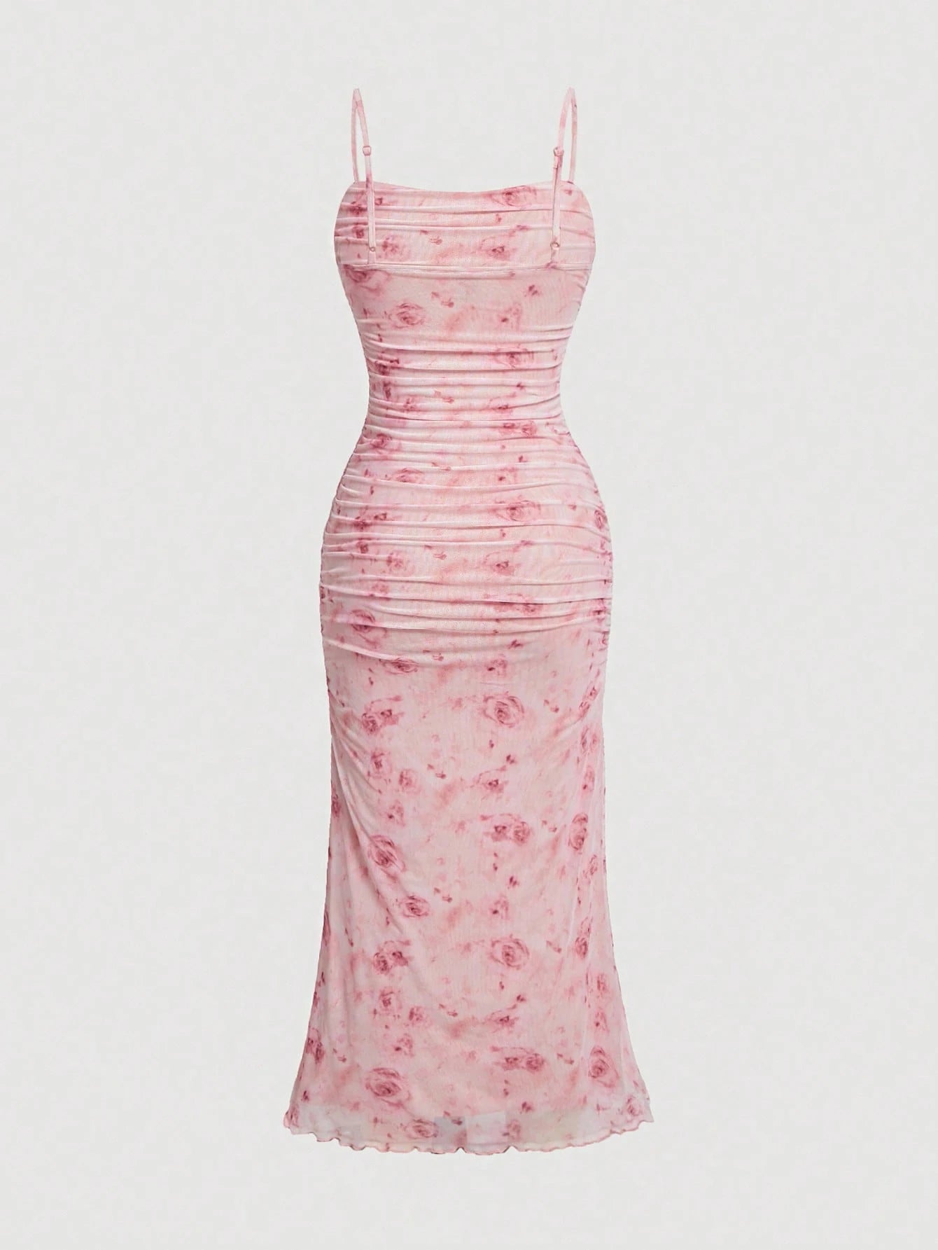 Este vestido midi floral con tirantes finos combina un estilo bohemio con una silueta elegante que realza la figura. Su diseño ajustado con corte tipo sirena resalta las curvas de forma natural, mientras el fruncido en el abdomen aporta textura y comodidad visual. El estampado floral integral en tonos rosados transmite frescura y romanticismo, ideal para citas, eventos o el Día de San Valentín.