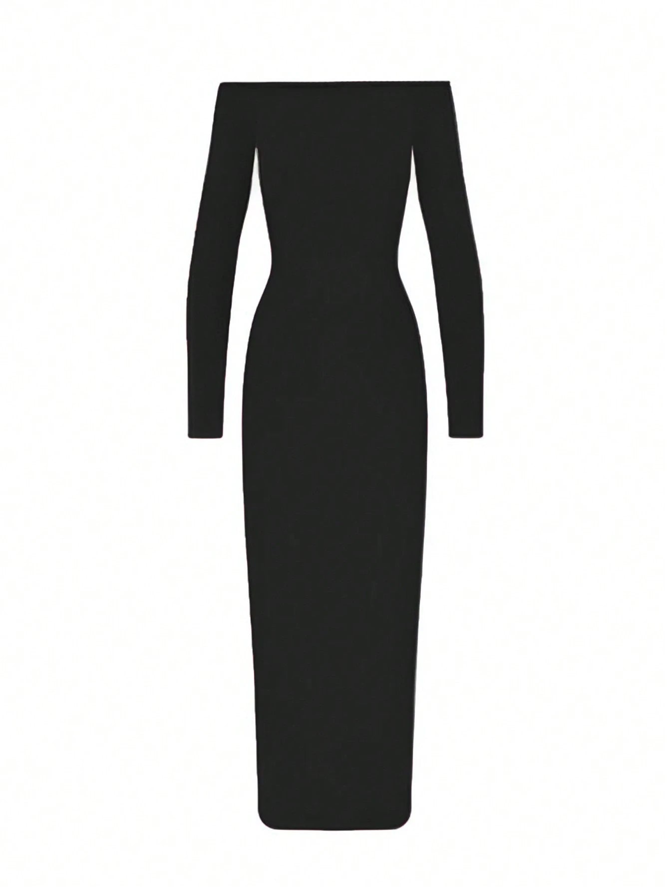 Este vestido negro elegante de hombros descubiertos largo ofrece una apariencia sofisticada y moderna, diseñada para resaltar la figura con un ajuste impecable. Gracias a su confección en tela tricotada y su elasticidad alta, el vestido se adapta suavemente a las curvas mientras mantiene un look estilizado y limpio. Además, su diseño de manga larga aporta equilibrio visual y un toque de distinción, ideal para noches especiales o eventos formales en los que quieras destacar sin esfuerzo.