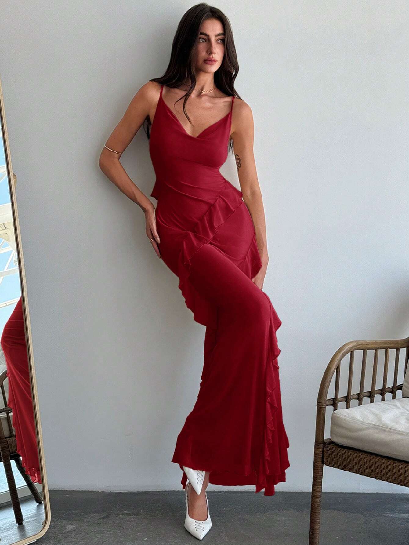 Este espectacular vestido rojo largo con volantes y abertura es la definición de sofisticación moderna. Diseñado para destacar en bodas, fiestas o eventos de noche, su corte ajustado y tela tricotada abrazan la silueta con elegancia y fluidez. Los delicados tirantes finos realzan los hombros y el escote drapeado añade un toque sensual sin perder la clase.