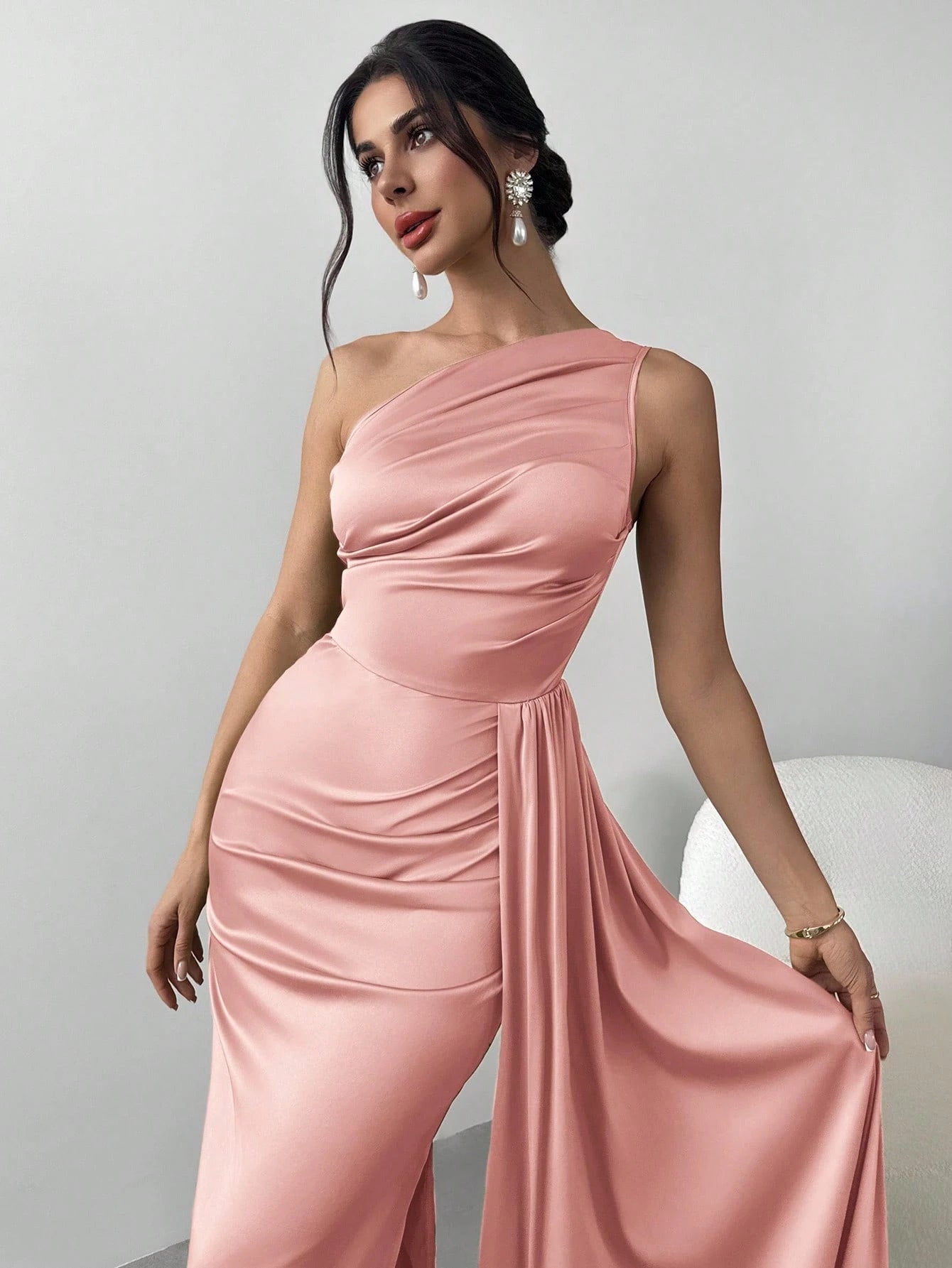 Este vestido rosa largo asimétrico elegante de noche es la definición de sofisticación y estilo. Su diseño con cuello asimétrico y corte ajustado resalta la silueta femenina con un aire de distinción. El detalle drapeado y el fruncido lateral aportan textura y movimiento, mientras la caída de tela al costado crea una figura esbelta y armoniosa.